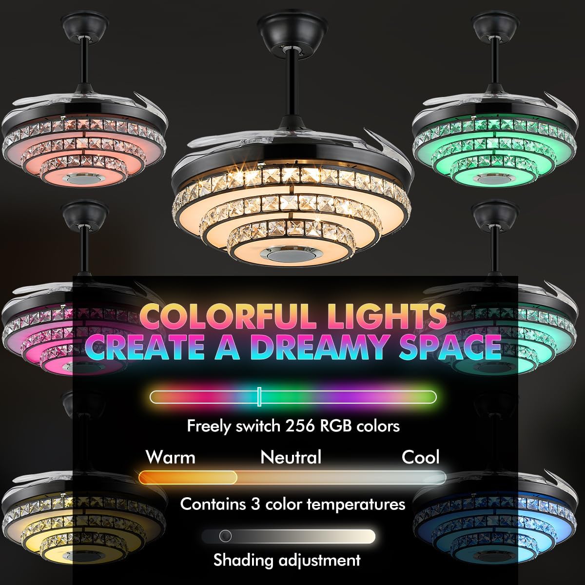 • APP Control Chandelier Fan:42" Retractable ceiling fan Built-in bluetooth speaker music player, you can play news and music anytime. RGB ceiling fan is suitable to be used as a background light for birthday parties or home parties