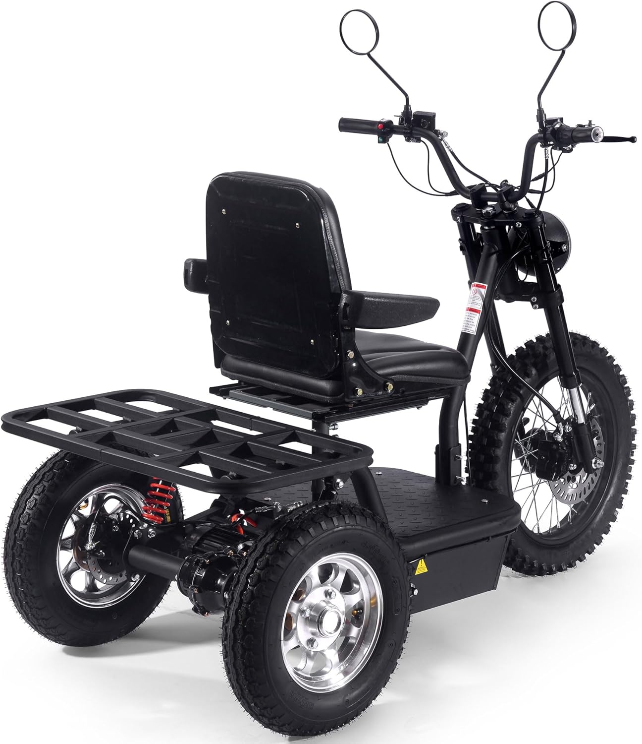 The New MotoTec 60v 1800w Electric Powered Trike is a torque monster ready to conquer any terrain! This is a three-wheel electric scooter that you can ride while sitting or standing, this makes it very convenient for use at events, security and warehouse floor operations or for just plain fun! It's like a three-wheel Segway but at a fraction of the price! Powered by a 1800 watt servo motor with speeds up to 18 miles per hour. It can achieve a 20+ mile range on a full charge. It features a 24 inch pneumatic front tire, two 18 inch pneumatic rear tires and a comfortable seat with a backrest and armrests. This personal transporter is easy-to-operate with a twist throttle and front/rear hydraulic brake system. Comes standard with front and rear suspension, key, battery meter lights, headlight, mirrors, reverse and carrying rack. Specs: Motor power: 1800 Watt Servo Motor Transmission: Differential Gearbox (no chains or belts) Battery: 60v/20ah (Five 12v/20ah Sealed Lead Acid Batteries) Speed: 7, 14, 22 MPH (3 selectable speeds) Max Weight Capacity: 450 Lbs. Recommended Age: 13 and up Charger Included Brakes: Front/Rear Hydraulic Battery life: Over 300 charges Range per charge: 20+ Miles (weight dependent) Recharge time: 4-8hrs Seat: Padded with Backrest/Armrests Front Wheel Diameter: 24 inch air filled tire (90/100-16) Rear Tires Diameter: 18 inch air filled tires (4.0-10) Seat Height: 35in Min - 40in Max Scooter Dimensions: 66x36x49 inches Scooter Weight: 240 lbs Shipping Carton Size: 45x40x32 inches Shipping Weight: 310 lbs Ground Clearance: 6 inches Warranty: 60 days parts replacement