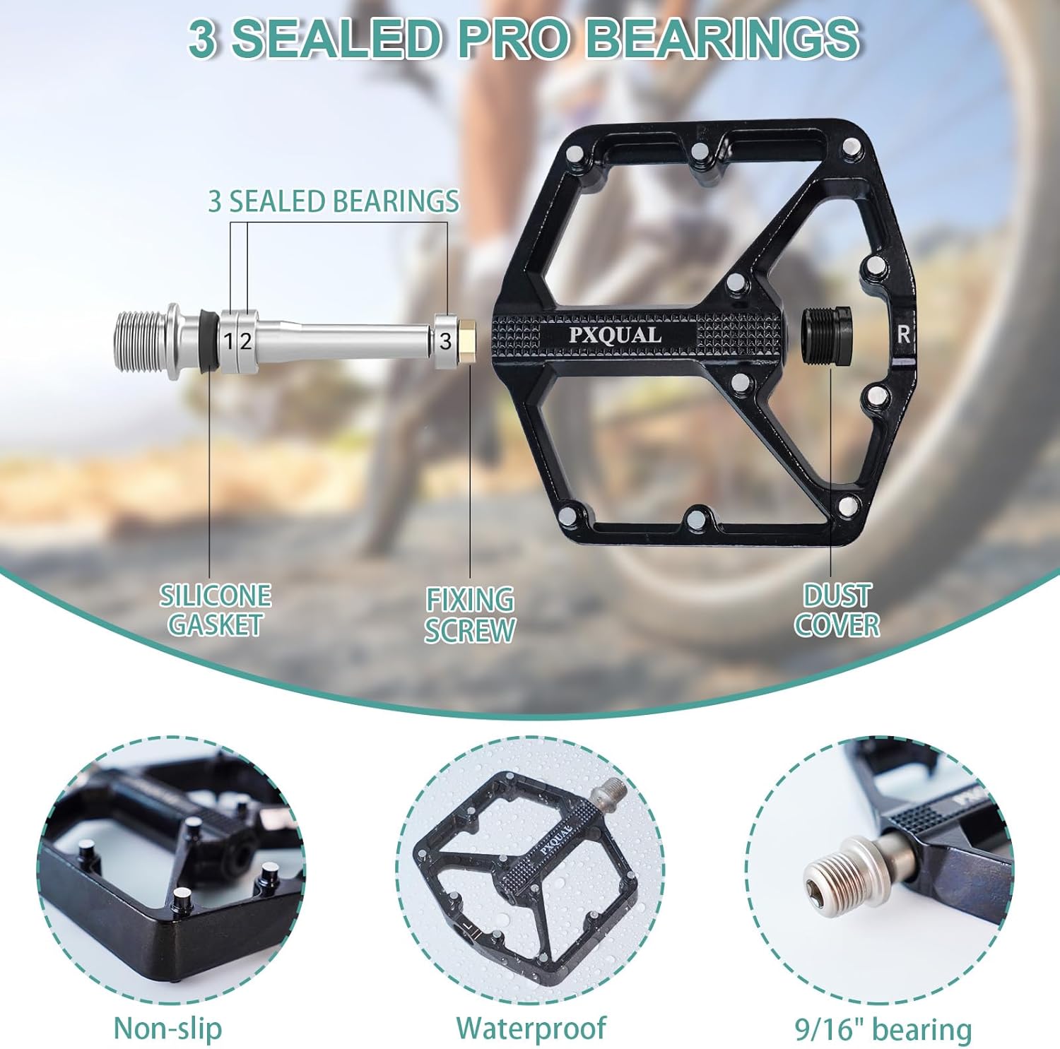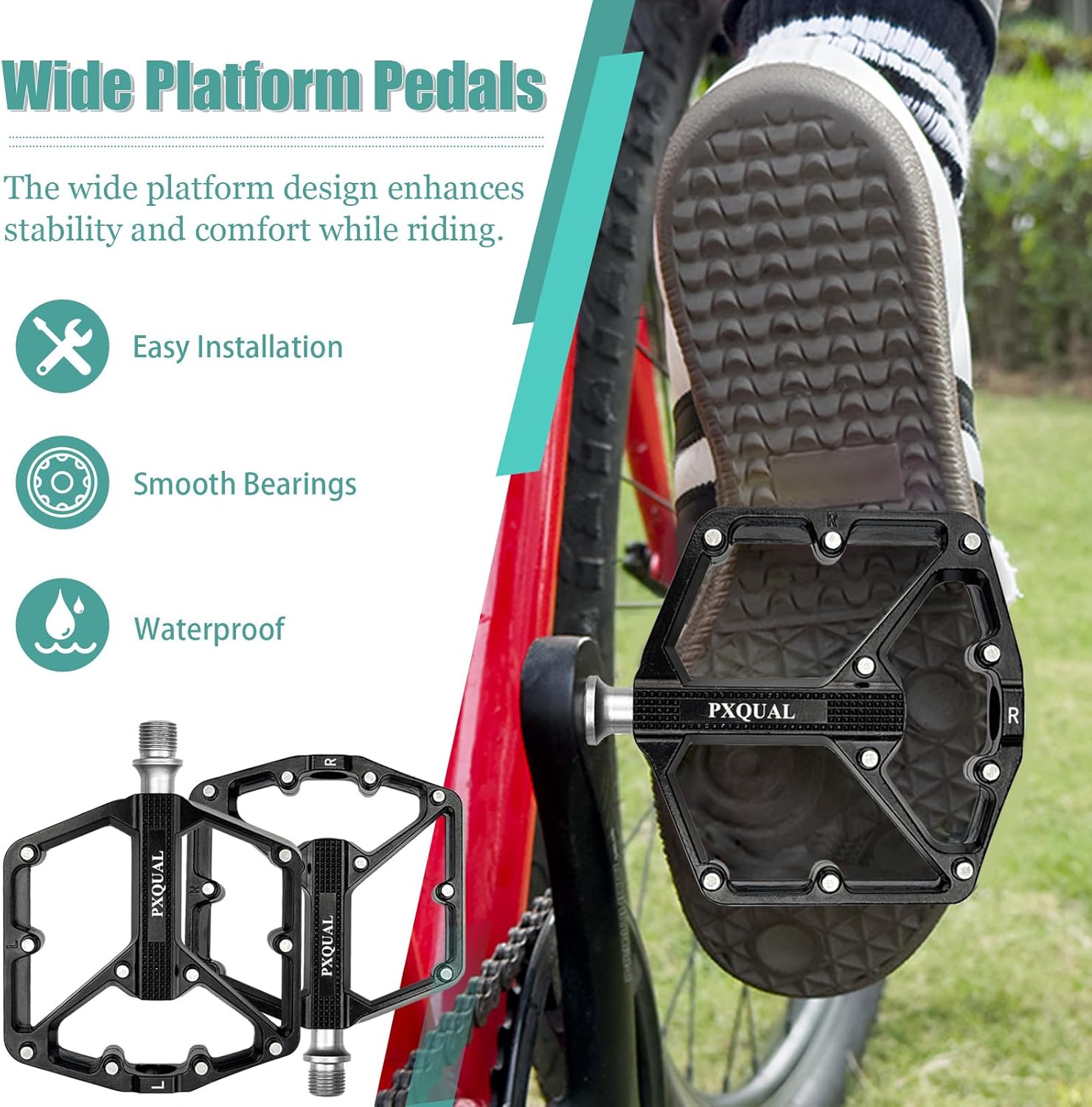 PXQUAL Mountain Bike Pedals Are Made Of Aluminum Alloy Pedal Body And High Strength Cr-Mo Spindle, Ensuring They Can Withstand The Rigors Of Off-Road Riding.The wide platform design offers a larger surface area for the rider's foot, enhancing stability and comfort during rides.About Road Bike PedalsLARGE PLATFORM - Wide platform pedals size 4.96*4.05*0.74inches (126*103*19mm) and weight 7.09oz/201g each pedals, The larger contact area helps riders maintain better balance, reducing the risk of slipping or losing controlSEALED BEARING -The platform pedals spindle was completed sealed to prevent water and dust from entering, which can significantly extend their lifespan compared to open bearings.NON-SLIP - 10 pins on each side effectively increase friction, whether you are mountain biking, road cycling, or commuting, anti-slip pins can enhance your riding experience by providing reliable grip.THREAD SIZE - 9/16" thread is suitable for most of the bikes, including mountain bikes, road bikes, BMX, folding bikes, urban bikes, travel bikes, hybrid bike, old school, cyclo-cross bikes, dirt jumper, fixed gear bikes, cruiser, e-bike, commuter bikes, unicycles, tricycle, and etc.Specification:● Material: Aluminum alloy + Cr-Mo● Weight: About: 14.18oz/402g● Size: 4.96*4.05*0.74inches (126*103*19mm)● Color: Electroplated color