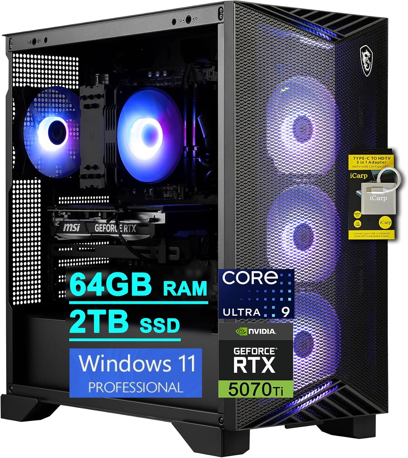 OVERVIEW: Product Details: Microprocessor: Intel 24-core Ultra 9 285 Processor (Base Clock 2.5GHz, Max Boost Clock Up to 5.6GHz, 36MB SmartCache, 24 Threads) Memory:32GB RAM Storage:2TB SSD Operating system: Microsoft Windows 11 Home Graphics & Video: Dedicated NVIDIA GeForce RTX 5070 Ti Graphic Key Features: CPU Air Cooling: Yes Wi-Fi 7: Yes Multi-format SD media card reader: No Power Supply: 750W 80+ Gold Ports: 5 x USB-A 3.2, 1 x USB-C 3.2, 4 x USB 2.0, 1 x HDMI 2.1, 3 x DisplayPort 1.4a, 1 x 5Gb RJ45 Ethernet Additional Information: Dimension: 19.4" x 9.1" x 19" Weight: 26.9 lbs