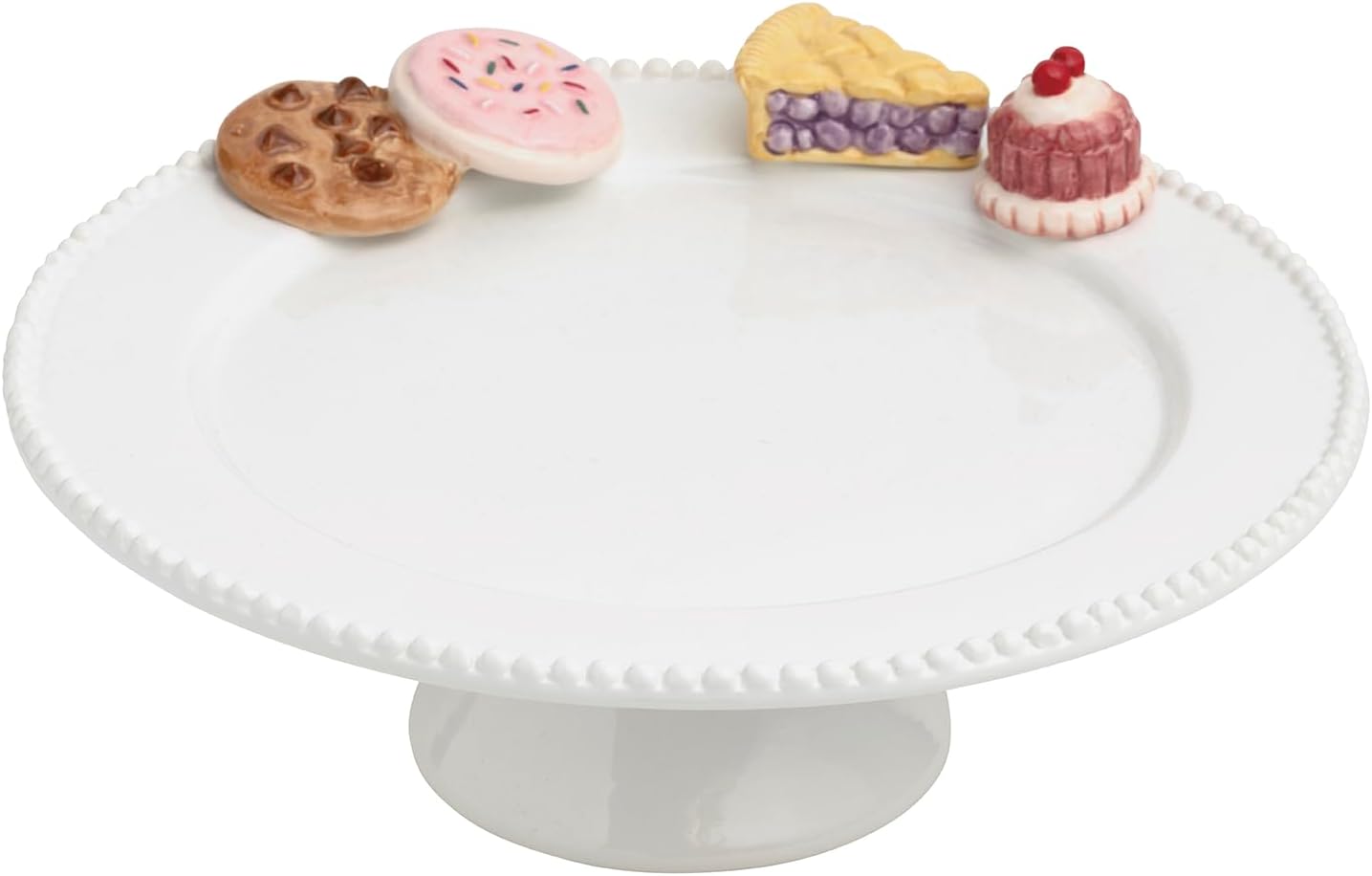 Elevate your dessert presentation with the Mud Pie White Ceramic Sweets Pedestal from the Circa collection, crafted in elegant white dolomite and designed to showcase your favorite treats in style. This beaded serving pedestal features delightful debossed lettering and hand-painted sweet treat accents, adding a whimsical, artisanal touch to your table. Measuring 3 1/2" high with a 10" diameter, it’s the perfect centerpiece for cakes, pastries, or cookies. For best results, hand wash only and avoid microwave use to preserve its beautiful finish.