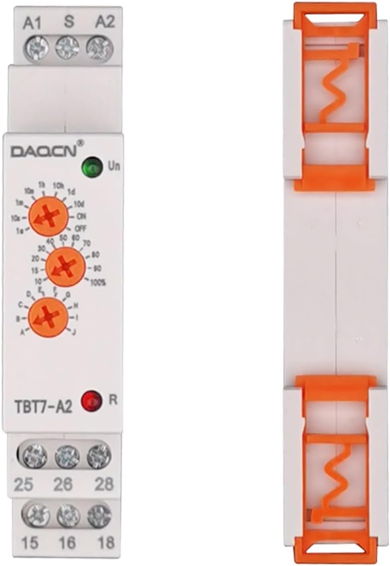 relayRelaysAPPLICATIONMulti-function time relay can be used for industrial equipment lighting control heating element control motor fan control.There are10 delay modesand itsdelay rangecovers0.1secto 10 days.Features-10 delay modes: -5delay modescontrolled by power-4delay modes controlled by signals-1pulse conversion mode- Ultra-wide delay range can be setfrom0.1sec-10 days (10 gears).- Available with AC/DC 12V-240V ultra wide operating voltage.- Relay working status is indicated by LED indicator light.- Ultra small volume only 18mm wide 35mm rail installation.Model and MeaningRated working supply voltage:A220:AC220VW240:AC/DC12V-240VOutput contact groups1:1Z2:2ZItem No.TBT7-A1TBT7-A2FunctionA B C D E F G H I JSupply terminalA1-A2Rated control supply voltageAC/DC 12-240V(50-60Hz)Consumed powerAC0.09-3VA/DC 0.05-1.7WRated control supply voltageAC 220V(50-60Hz)Consumed powerAC max.6VA/1.3WAC max.6VA/1.9wAllowable power supply fluctuation range-15%;+10%Power indicator lightGreen LEDDelay range0.1sec-10 days NO NCSetting modeKnobSetting precision10%Repeat precision0.2%Temperature fluctuation error0.05%/ at=20(0.05% at=68)Output contact parameter1 set of conversion contacts2 sets of conversion contacts16A/AC1250VAC/24VDCMin transfer power500mWOutput relay indicationRed LEDMechanical life1×107Electrical life (resistive load)1×105Reset timeMax. 200msWorking ambient temperature-20~+55Storage and transport ambienttemperature-35~+75Installation mode35mm railinstallationProtection levelIP20Installation positionAnyInstallation altitude height2000mPollution level2 Wiring capacity1×2.5mm2o