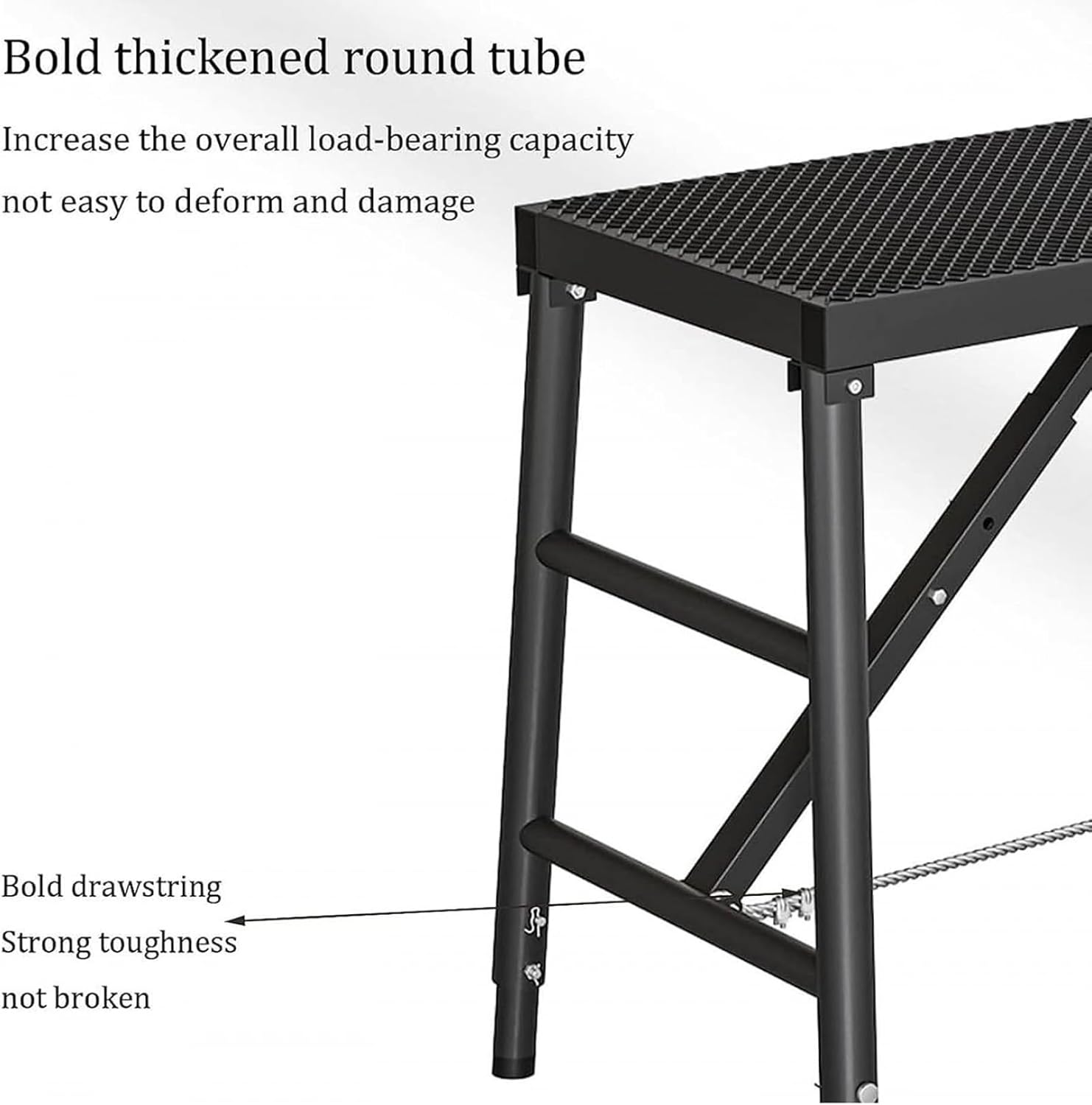 New design incorporates the various functions of scaffolding and step ladders, portable folding scaffolding equipment, adjustable height universal work platform not only great for washing vehicles but also ideal for painting wall, windows of cleaning.♦ product specification:Product name: Folding scaffoldProduct Material: Carbon SteelProduct color: blackAdjust height: 5 levelsWeight Capacity: 880lbsProduct use: home decoration, DIY, car washing, window cleaning, lifting things, painting walls, general maintenance work.♦ Size introduction:Table length 120cm * table width 30cm * height 64-94cm adjustable, leg distance 44cmTable length 150cm * table width 30cm * height 79-119cm adjustable, leg distance 48cmTable length 180cm * table width 30cm * height 91-151cm adjustable, leg distance 52cmTable length 150cm * table width 40cm * height 79-119cm adjustable, distance between legs 54cmTable length 180cm * table width 40cm * height 91-151cm adjustable, leg distance 57cm♦ package1 * working platform♦ Notice1. Due to manual measurement, please allow 1-10mm deviation.2. Due to the light and screen difference, the product's color may be slightly different from the picture.3. If you have any questions or need any help, please feel free to write an email to contact us, we will get back to you within 24 hours.