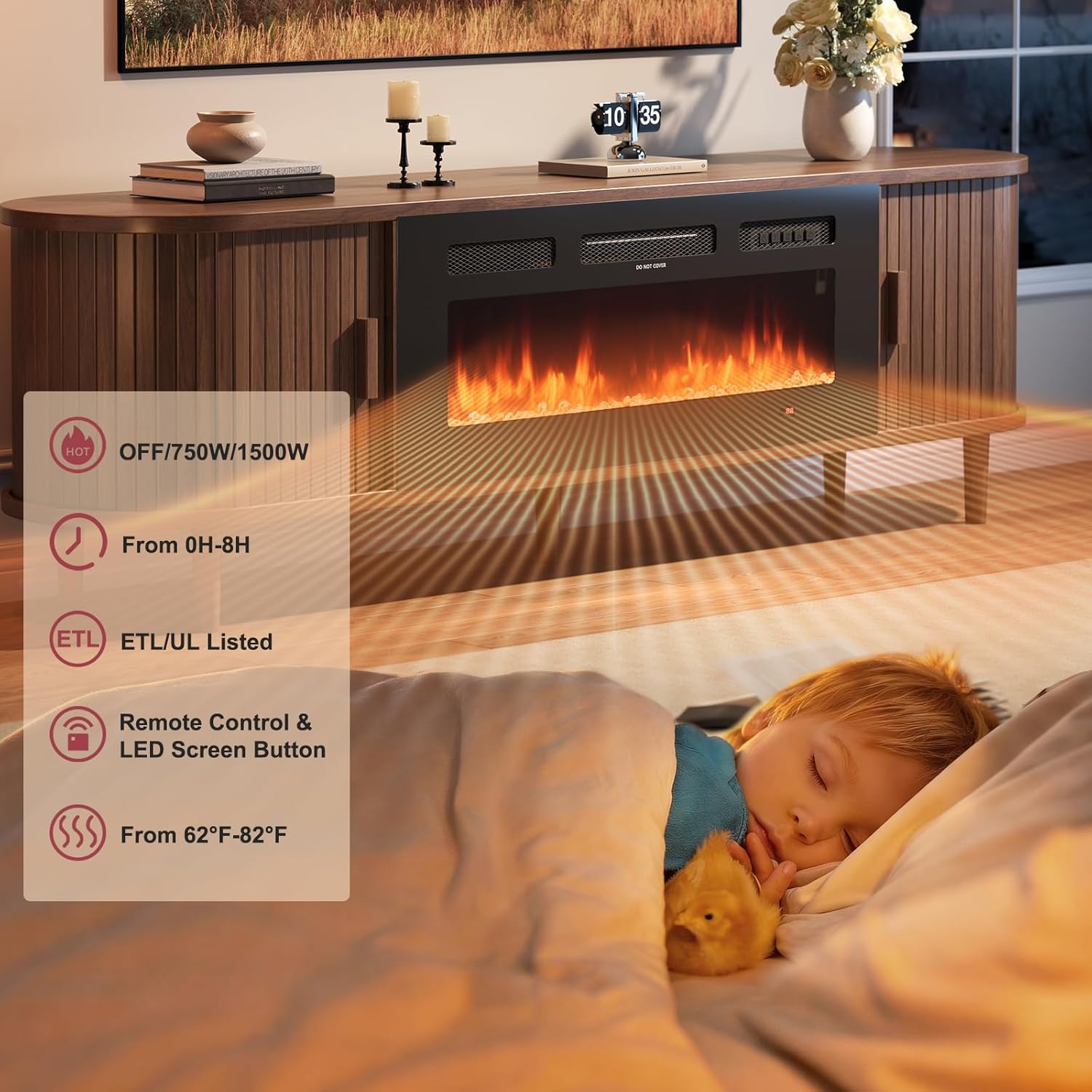 • Mid Century Modern Design: Fluted Fireplace TV Stand boasts mid Century Modern style elevates your living room's ambiance. It can accommodate a television up to 80 inches, making it a stylish entertainment center with a fireplace