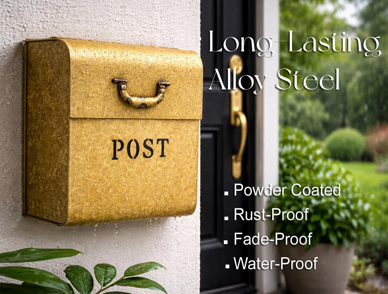 NACH CJ Large Mailbox with Powder Coated Finish, Wall Mount Mailboxes for Outside, Rust Resilient Metal Mailbox for Parcels, 12.6 x 6.9 x 14.2 Inches, Metallic Gold, FZ-M1002