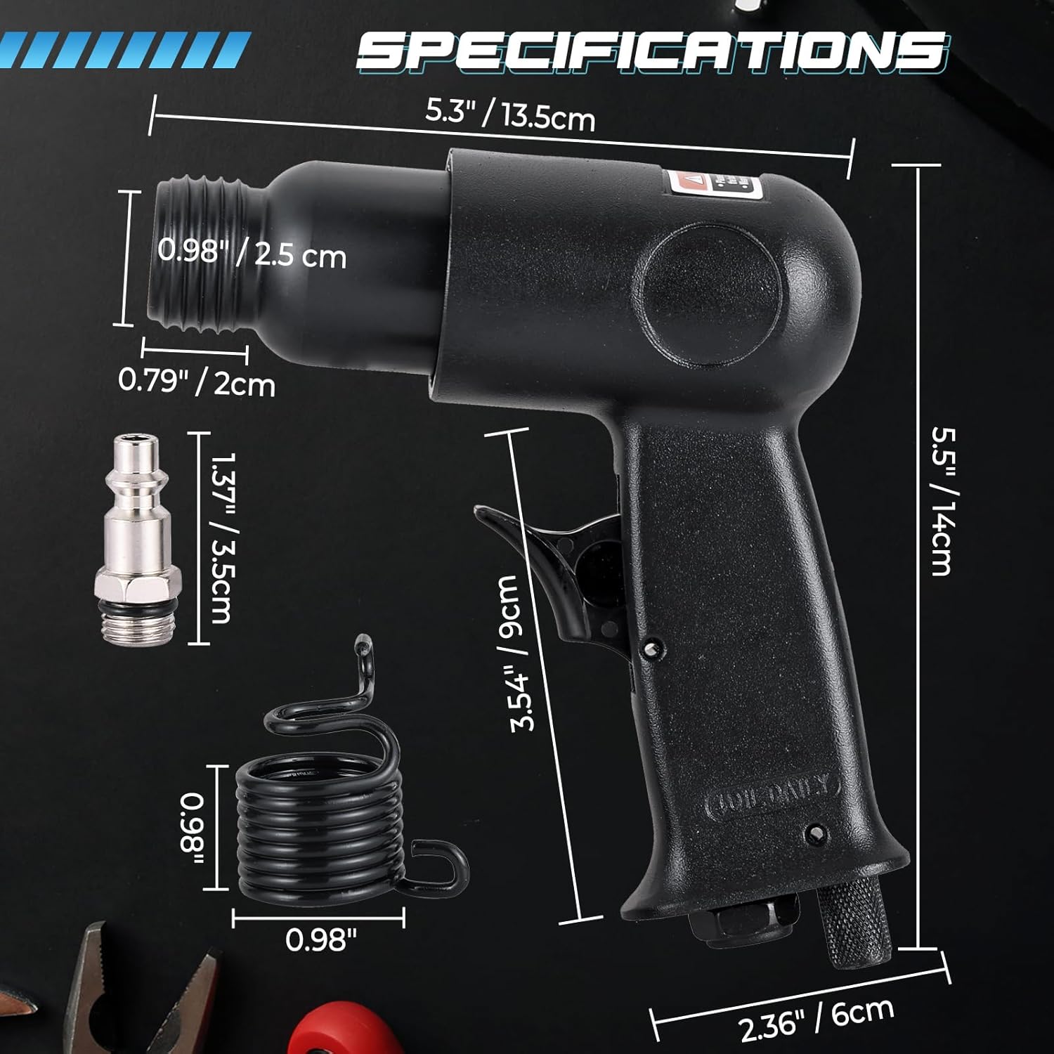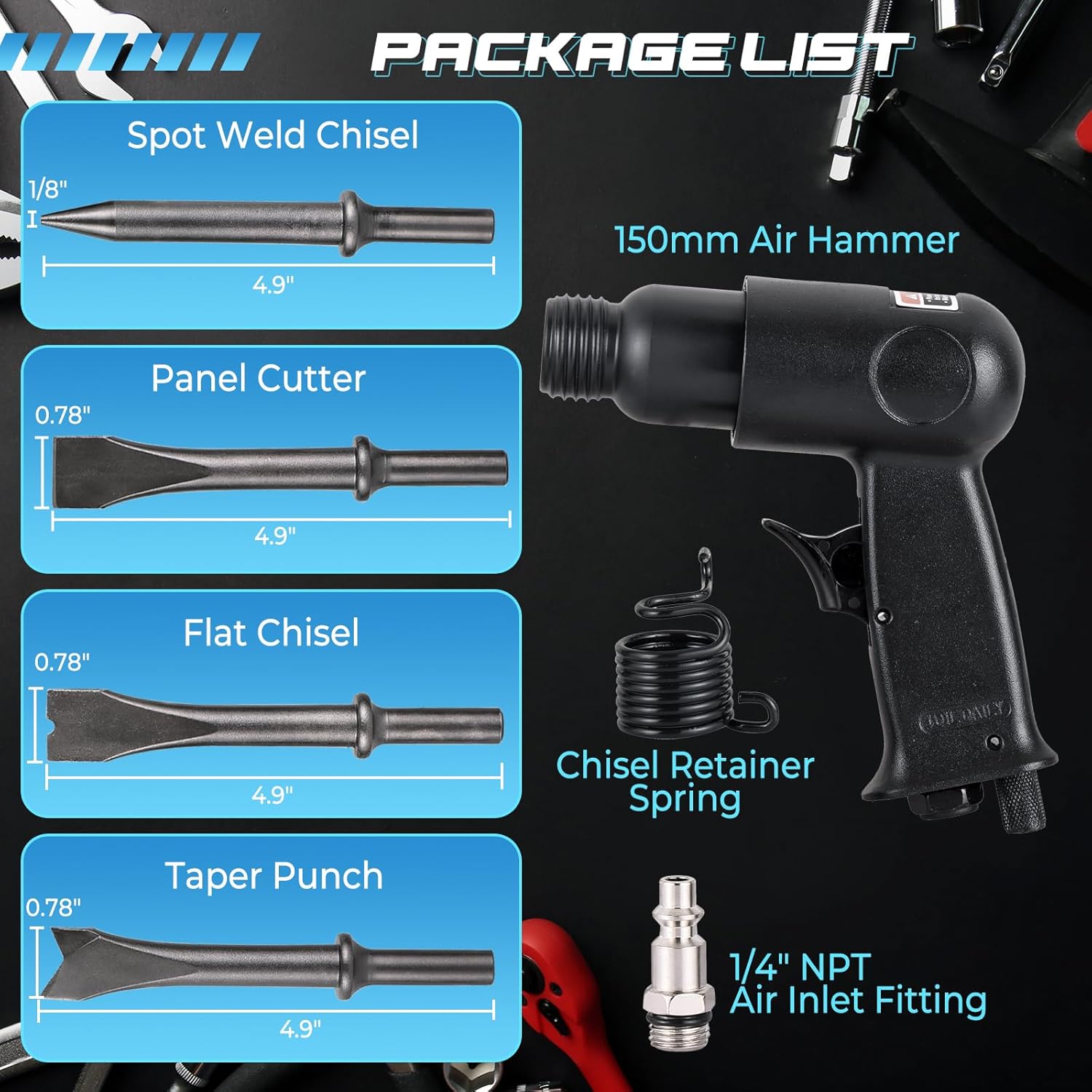 Package Includes: 1 x NATGAI 150mm Air Hammer Kit with 4 Chisels (Black) & 1 x NATGAI 5 Pcs Air Smoothing Hammer Bits Set. Features of NATGAI Air Hammer Kit: Heavy-Duty & Long-Lasting Build: Constructed with a rugged aluminum alloy body and hardened carbon steel chisels, this air chisel hammer kit is built for high-impact, heavy-duty use—delivering reliable performance for demanding pneumatic tool applications. Complete Air Hammer Chisel Kit: This air hammer kit includes 4 precision air hammer chisels—taper punch, panel cutter, flat chisel, and spot weld chisel (4.9" x 0.78"), providing versatility for a wide range of repair, fabrication, and metalworking tasks. 4500 BPM Pneumatic Air Hammer Power: Featuring a 150mm (5.9") stroke and up to 4500 blows per minute, this pneumatic air hammer delivers strong, consistent impact for cutting, scraping, chiseling, and demolition—an essential air tool for automotive and industrial work. Efficient & Time-Saving Operation: Designed to increase productivity, this air hammer chisel set offers fast, effective performance that reduces effort and work time on tough jobs like rust removal, drilling, demolition, and metal separation. Wide Air Tool Compatibility: Equipped with a standard 1/4" NPT air inlet, this air hammer connects easily to most air compressors. Ideal for garages, workshops, body shops, and industrial settings—perfect for spot weld removal, exhaust work, body panel cutting, and metal shaping. Product Specifications: Material: Aluminum Alloy & Carbon Steel Package Quantity: 1 Air Hammer + 4 Chisels + 1 Spring + 1 1/4” Fitting. Color: Silver Features: Durable Alloy Steel Construction: Made from high-quality alloy steel for strength, corrosion resistance, and long-lasting performance. Versatile Application: Ideal for tire repairs, metal forming, masonry demolition, and rock crushing.