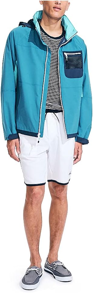 Fight the elements in this lightweight jacket with an athletic colorblock design. It features a concealed drawstring hood with mesh lining to keep you cool, and multiple pockets to keep your essentials safe and close at hand.