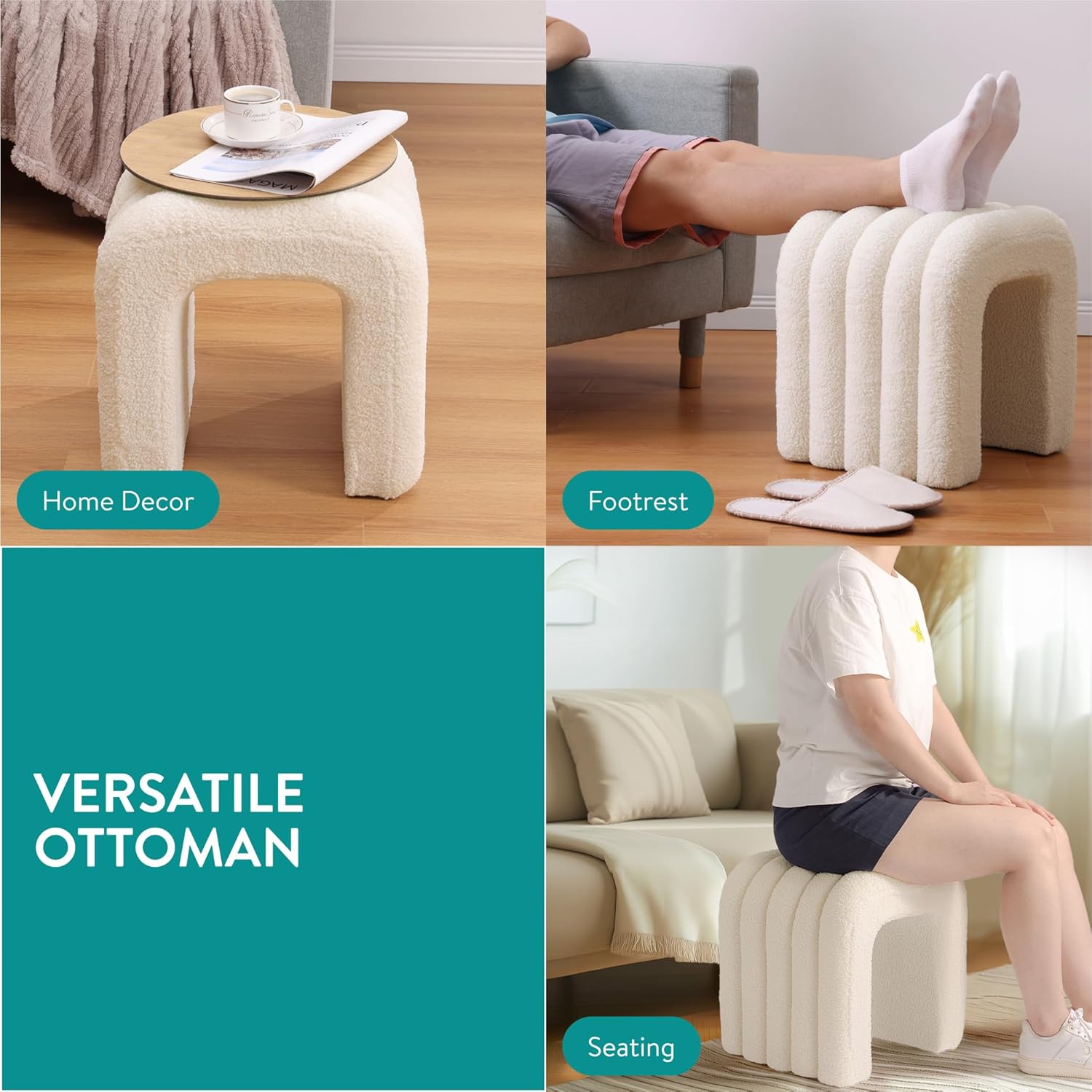 Ready to transform your living space with a touch of elegance and comfort?Elevate your living space with this versatile, stylish ottoman footstool by Navaris. This chic piece doubles as a vanity stool, adding a touch of elegance to any room. With its compact design, it's the perfect addition to your living room decor, bedroom, or even your nursery furniture set. It's more than just a footstool - it's a comfy chair to sit on, a makeup chair for your vanity, and a stylish pouffe footstool that complements any interior design.Highlights:- Compact and versatile design- Stylish living room decor- Soft white boucle material- Perfect nursery furnitureSPECIFICATIONSMeasurements: 16.14" x 13.8" x 16.9" (41 cm x 35 cm x 43 cm)Materials: MDF, Wood, Polar fleece, SpongeColour:Cream/WhiteProduct Info1 x Arch ottoman
