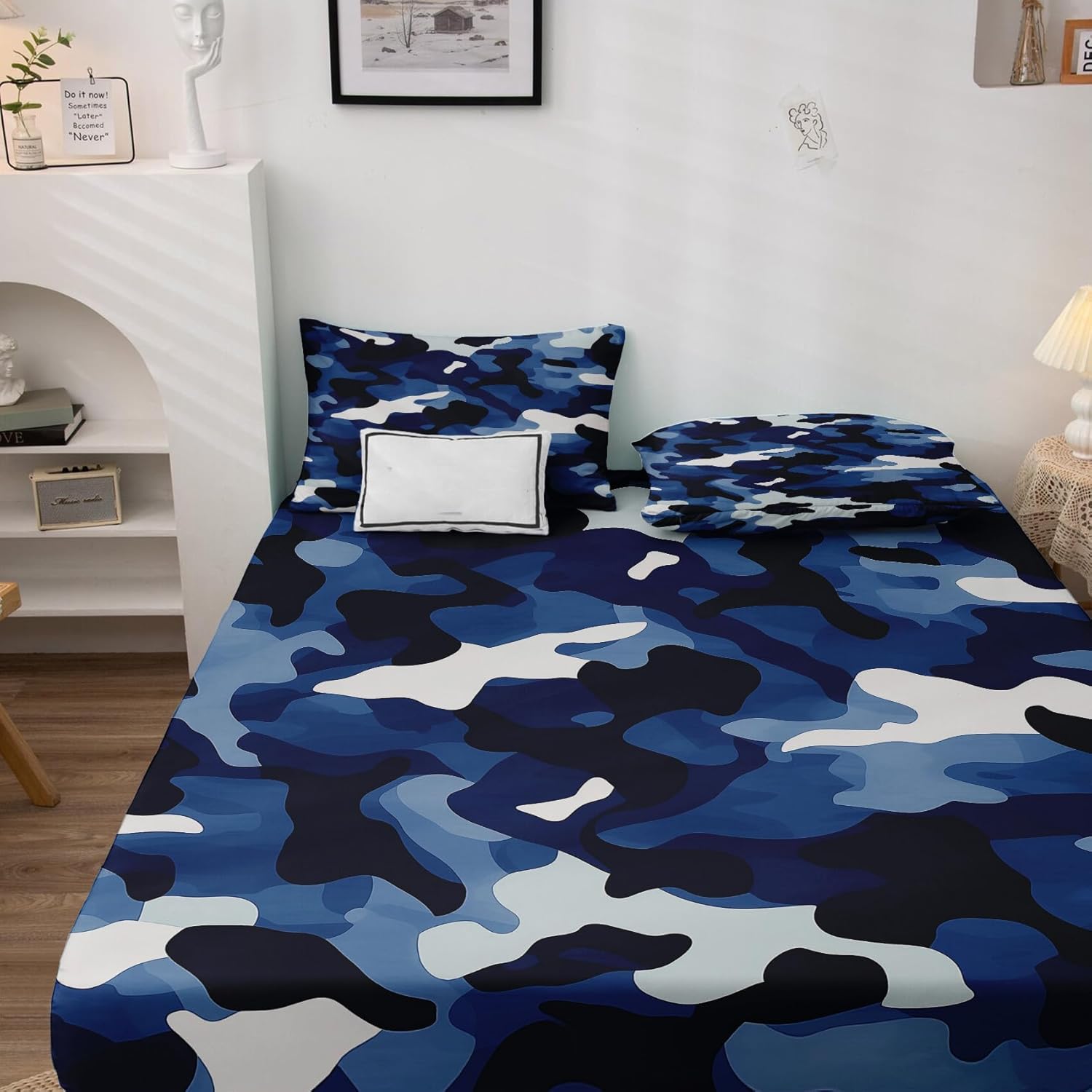 Navy Blue Camouflage Sheets Full Size Sheet Sets - Military Camo Bed Sheets, Soft & Deep Pocket & Wrinkle Free Bedding Sheets & Pillowcases, 1 Fitted Sheet, 1 Flat Sheet, 2 Pillow Cases