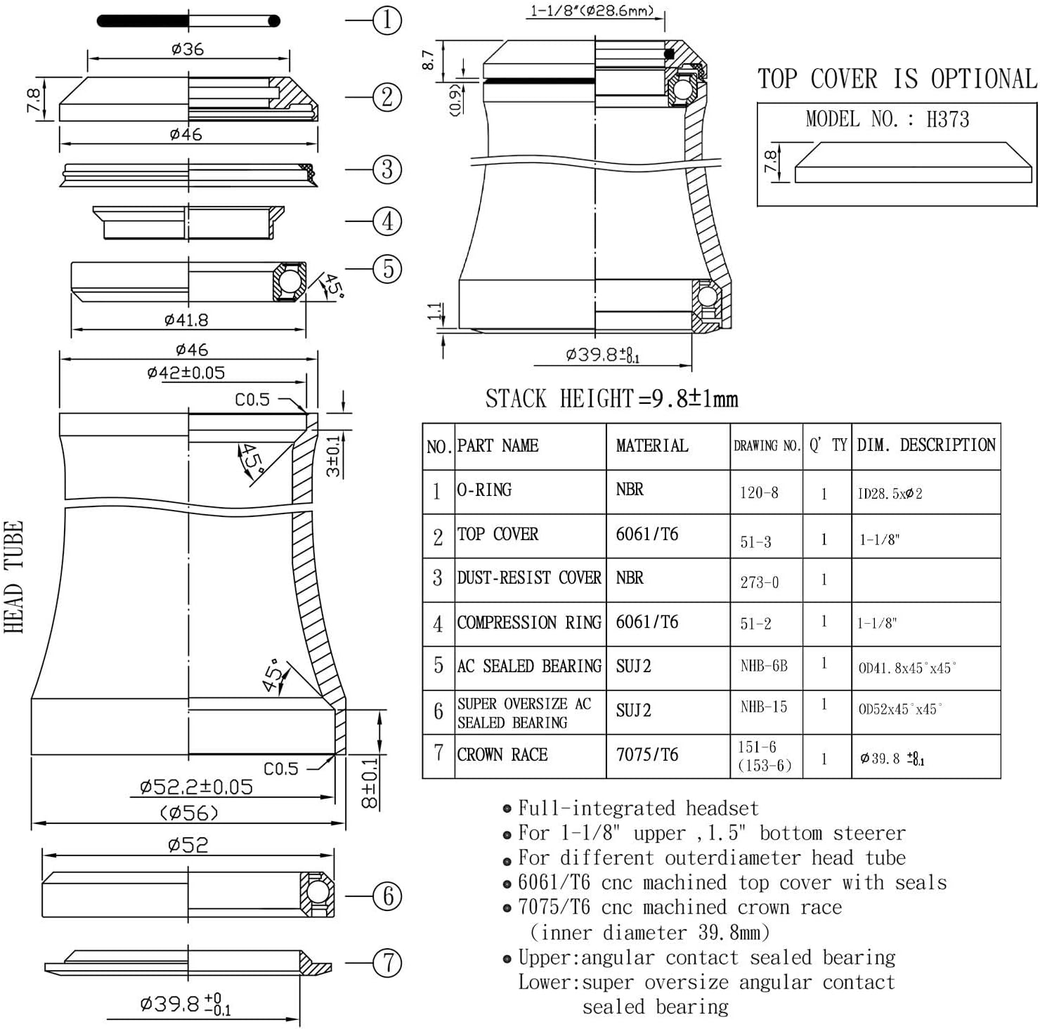 Full-integrated headset- For 1-1/8" upper ,1.5" bottom steerer- For different outerdiameter head tube- 6061/T6 cnc machined top cover with seals- 7075/T6 cnc machined crown race (inner diameter 39. 8mm)- Upper: angular contact sealed bearing- Lower: super oversize angular contact sealed bearing- Size: 1.5" Head Tube Reduced to 1-1/8" Fork Tube Threadless Headset- ACB Sealed- Bearing: NHB-6B & NHB-15 - Stack Height: 8.7+1.1=9.8mm 1mm- Weight: 101g (include Alloy top cap) - Color: Black (as pic. shown)- Made in TAIWANContent: 1 set (With top cap and starnut) / pack