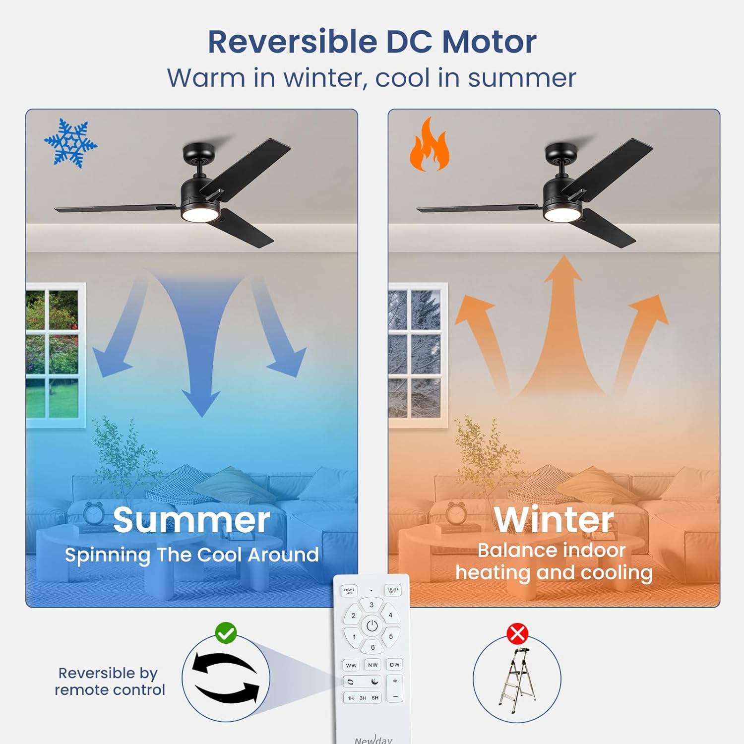 | Special Features | 3CCT Dimmable LED (3000K-6500K), Dual-Finish Reversible Blades, Reversible Airflow, Smart Memory Function, Super Quiet DC Motor |