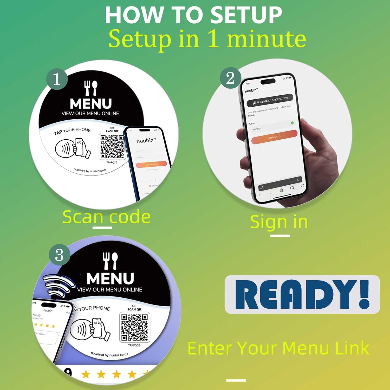 Upgrade your restaurant or café with this modern NFC Menu QR Code Sign – a sleek, round acrylic tag with adhesive backing that allows your customers to tap or scan to view your digital menu in seconds. Designed for seamless integration into any hospitality setting, this compact NFC QR code tag is the ultimate contactless solution for modern businesses. With dual functionality – NFC tap access and QR code scanning – you provide a smooth experience for all types of customers. Whether they use iPhone, Android, or any camera-enabled device, your online menu, order form, or booking link is just one tap or scan away. Works like a Review tap card or social media sign, this tag also supports platforms that provide visit stats – so you can monitor how many people are engaging with your digital link. No app is required, no subscription needed – a true plug-and-play solution. Setup is easy and fast. Just peel and stick the acrylic NFC tag with QR code on any smooth, non-metal surface like wood, tile, plastic, or glass. Avoid placing on metal, as it may interfere with NFC signal. This tag is perfect for front desks, checkout counters, tables, or takeaway stations. Compatible with all major online platforms – link it to your Shopify menu, Wix booking page, Squarespace menu, Calendly, or any URL you already use. Whether you run a food truck, restaurant, nail salon, barbershop, or coffee stand, this QR code sign for appointments, reservations, or menus adapts to your needs. Crafted from durable, round-cut acrylic, this tag has a clean, professional appearance that complements any interior. Unlike bulky menu holders or paper QR codes, it’s a minimalist, elegant solution for modern branding and digital engagement.