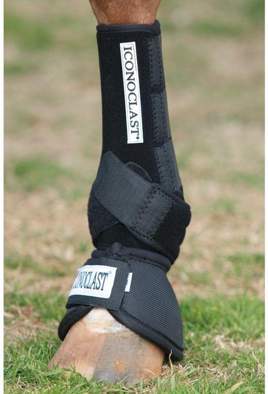 Iconoclast Tall Orthopedic support boots for horsesPatented double sling strapsUnparalleled lateral supportEvenly distributed support to suspensory branchesLifts and cradles the equine legReduce joint interference and restrictionAll around boot with hook and loop closureColors: Black andamp; WhiteSize: M, LHind pairEquestrian equipment for horse careWL-HT2 Iconoclast "Suspensory Support Matters"Iconoclast Orthopedic Support Boots feature our patented Double Sling Straps for unparalleled lateral support. With its evenly distributed support to the suspensory branches, Iconoclast is the only boot that truly lifts and cradles the equine leg. Designed to reduce joint interference and restriction, this is the perfect all around boot for every equine discipline. Iconoclast Orthopedic Support Boots will help your horse feel more confident with each step he takes, in and out of the arena.Never has this method of support been provided for the equine athlete through a strap on, non-restricting device. Iconoclast Support Boots not only protect against flexion injury, but they also offer effective benefit during rehabilitation from previous injury.Iconoclast Rehabilitation Boots were designed by horse trainers and leading veterinarians who were unsatisfied with the performance of every other support boot in the market place. The equine leg needs support and protection against the daily rigors of extreme physical activities and there has not been a boot that adequately meets those demands until now.