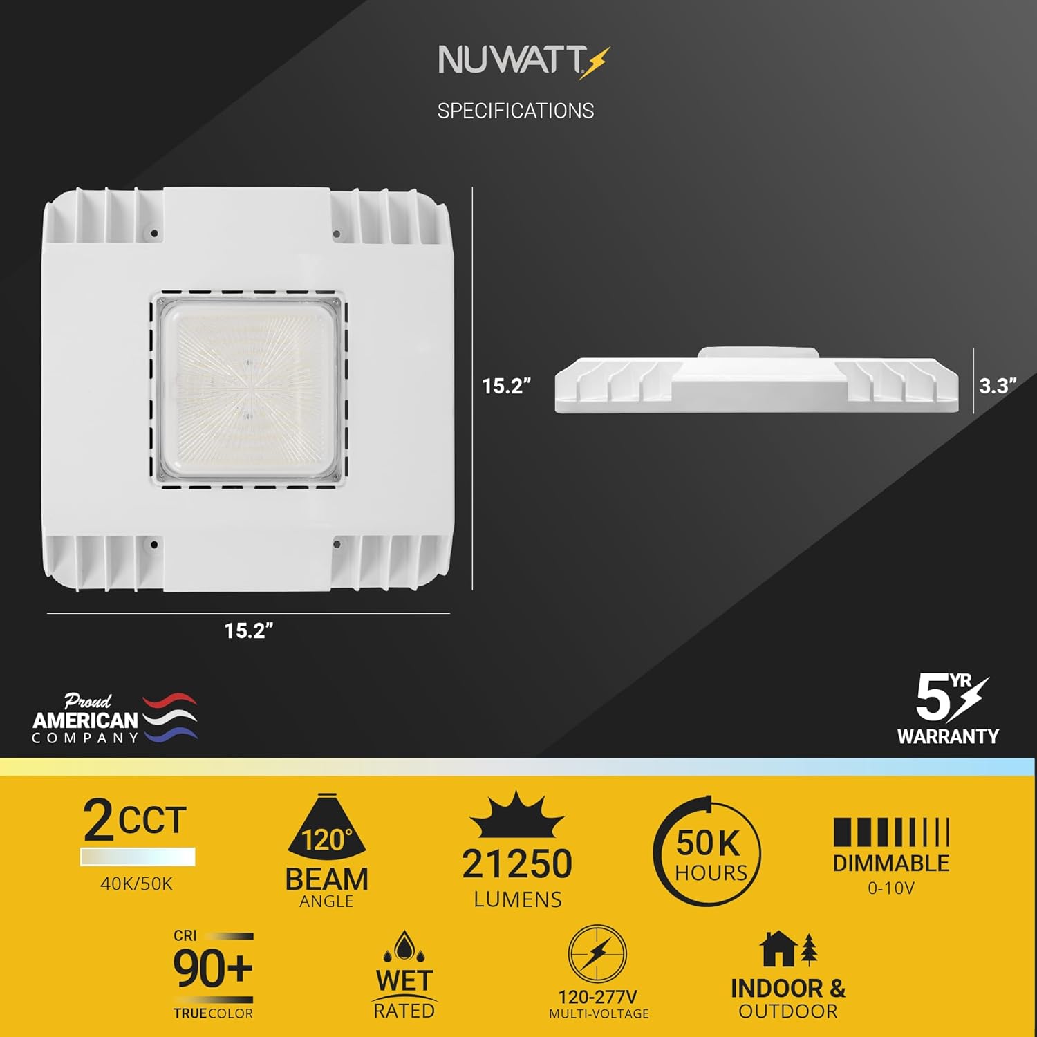 NuWatt’s 150W LED canopy lights are the ultimate solution for commercial and industrial spaces. Constructed with a heavy duty diecast aluminum enclosure, these canopy lights outdoor IP67 rated waterproof design can withstand the harshest conditions, providing airtight, weatherproof, non-corrosive, anti-rust protection against rain, ice, snow, dust, and extreme heat. They are the ideal gas pump canopy LED lights, canopy LED parking garage lights, carport lights, and more, this outdoor light fixture is a dependable choice for any application. Our canopy light are also a great replacement for 400W HID lamps and can offer significant energy savings because of their top tier quality and certifications by DLC, UL, and ETL. Plus, installation is easy with both pole and surface mounting options available, and the straightforward installation manual ensures a fast setup. The NuWatt LED canopy light impressive output of 21250LM at 130 LM/W deliver super bright illumination to every dark corner. Additionally, our canopy LED lights give you full control over your lighting environment with the ability to switch between 5000K daylight and 4000K cool white light, along with 0-10V dimmability. As a trusted US based, family run LED lighting company, we back our products with 5 year warranties and a 50000 hour lifespan. Discover the NuWatt advantage today.