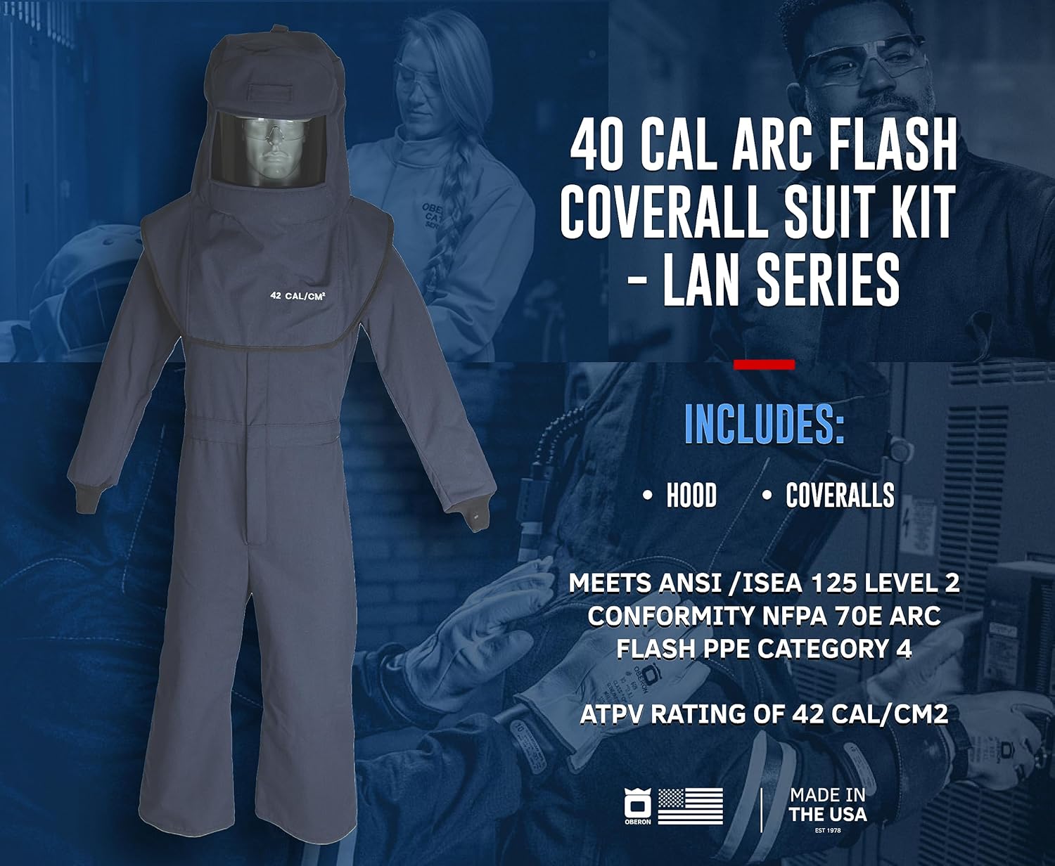 LAN4™ Series arc flash suit sets meet and exceed NFPA 70E PPE Category 4 standards and have an ATPV rating of 42 cal/cm2.