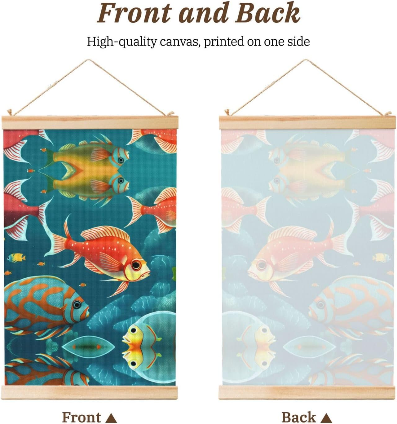 Our Ocean Underwater Fish Print Wooden Poster Hanger Is An Excellent Addition To Your Home Decor Or A Perfect Gift For Friends And Family. Made Of Selected Quality Canvas With Brilliant And Enduring Colors, This Wall Art Is Designed To Resist Water, Dust, And Fading, Ensuring The Bright And Vibrant Art Lasts. The Polyester Is Enclosed Between Two Teak Wood Hanger Scrolls With An Attached 35cm Rope For Easy Hanging. Installation Is Made Simple With The Included Two Nails In A Plastic Box. The Modern Minimalist Style Of Our Wall Hanging Complements Any Home Decor, Elevating The Artistic Ambiance And Brightening Up The Room. Experience The Elegant Transformation This Wall Hanging Scroll Painting Brings To Your Spaces Today.