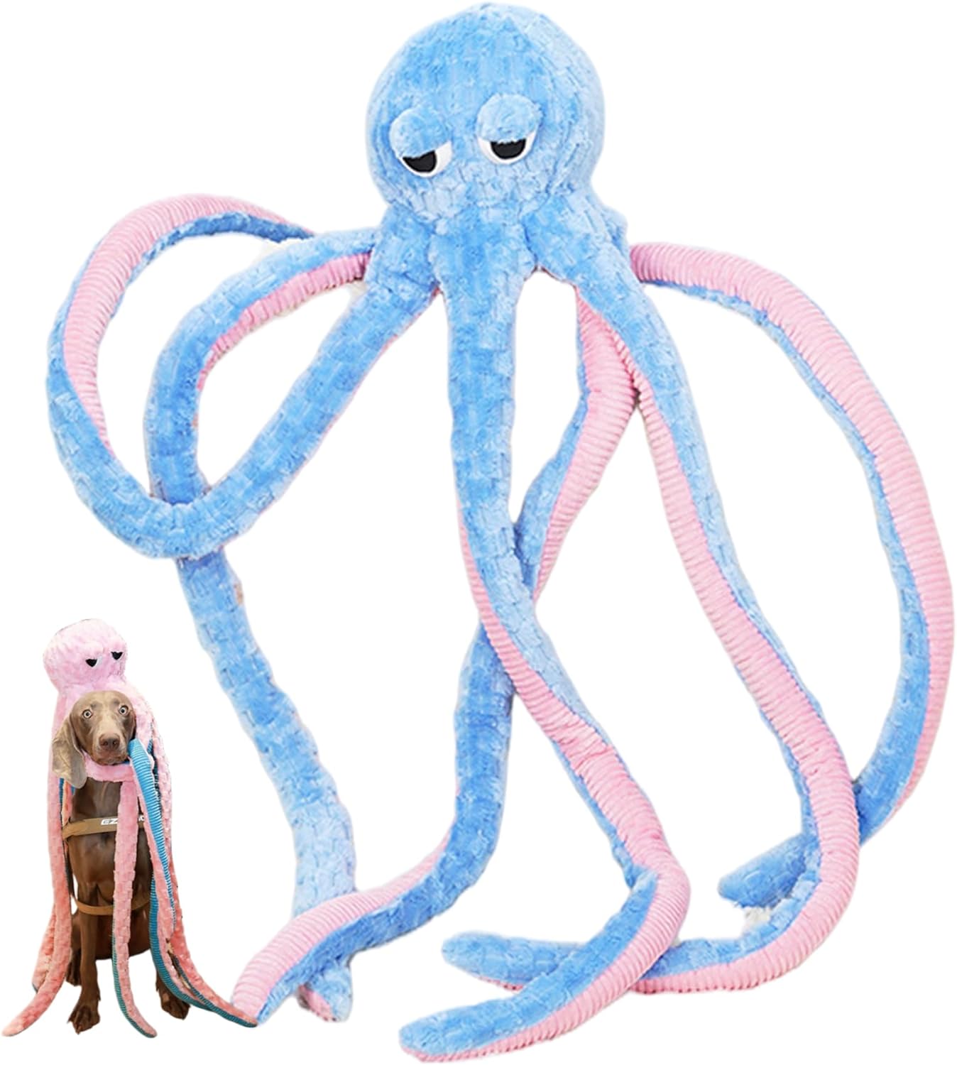 Description: This 40-inch Octopus Dog Toy combines durability and interactive fun, tailored especially for aggressive chewers who need long-lasting entertainment. Its robust construction features skin-friendly plush materials and reinforced seams, ensuring it withstands intense chewing while staying gentle on your pet's skin. Multiple built-in squeakers engage your dog's natural instincts, promoting active play and mental stimulation that help reduce anxiety and boredom caused by separation or inactivity. The large size enhances tug-of-war and fetch sessions, providing ample exercise and bonding opportunities for energetic and large dogs. Perfect for dogs prone to destructive chewing, this indestructible plush toy gives both comfort and entertainment, making it an ideal addition to your pet's toy collection to maintain their happiness and well-being. Features:. Octopus Dog Toy. -Color: Blue. -Material: Plush. -Size: about 40 inch. Note:Manual measurement, please allow slight errors on size.The colors may exist slight difference due to different screens. Package Including 1 x Octopus Dog Toy