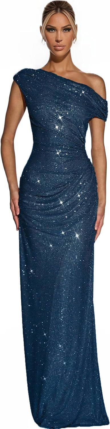 • One Shoulder Prom Dresses,Mermaid Long Cocktail Party Dress,Sequin Formal Evening Gown,Sparkly Bridesmaid Dress for Wedding Guest,Off Shoulder Wedding Dress for Bride,Short Sleeves Mother of The Bride Dresses for Women,Elegant Maxi Dress