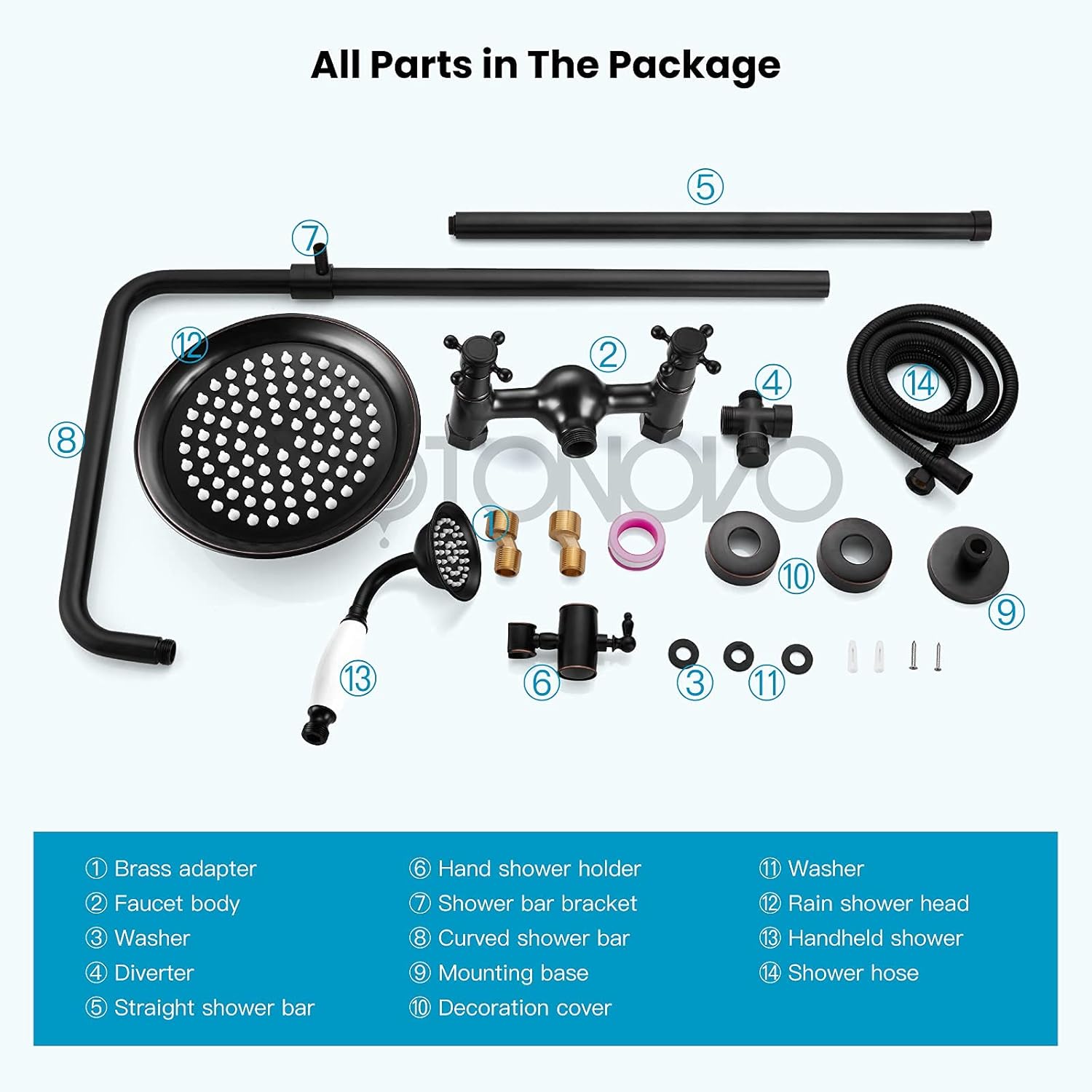 Product description This vintage bathroom shower fixture is for wall mount installation, Oil Rubbed Bronze finish and bass made can resist corrosion and tarnishing for whole faucet.This wall mount tub faucet is made of premium brass material, matte black finish to resist corrosion, anti-rust for long service life. 8’’ Oil Rubbed Bronze Shower Faucet Details: Faucet Material: Brass Finish: Oil Rubbed Bronze Mounting: Wall-Mount/2-Hole Top Showerhead: 20cm(8inch) Top Shower Material: Brass Hole Center(hot and cold water) Distance On The Wall: 15cm(6inch) Slid Bar Height: Adjustable 100cm-140cm(39.4"-55") Spray Hose: 150cm(59inch) Connection: NPT 1/2 Suggestion: Faucet should be installed 80-100mm above the floorBathtub Faucet Details: Material: Stainless Steel,Brass Finish:Matte Black Installation: Wall Mounted Functions: Dual Functions Valve Type: Rough-in Valve Tub Spout:180° Rotatable Tub Spout Tub Spout Reach:10.24inch(260mm) Shower Hose:59inch(150cm)