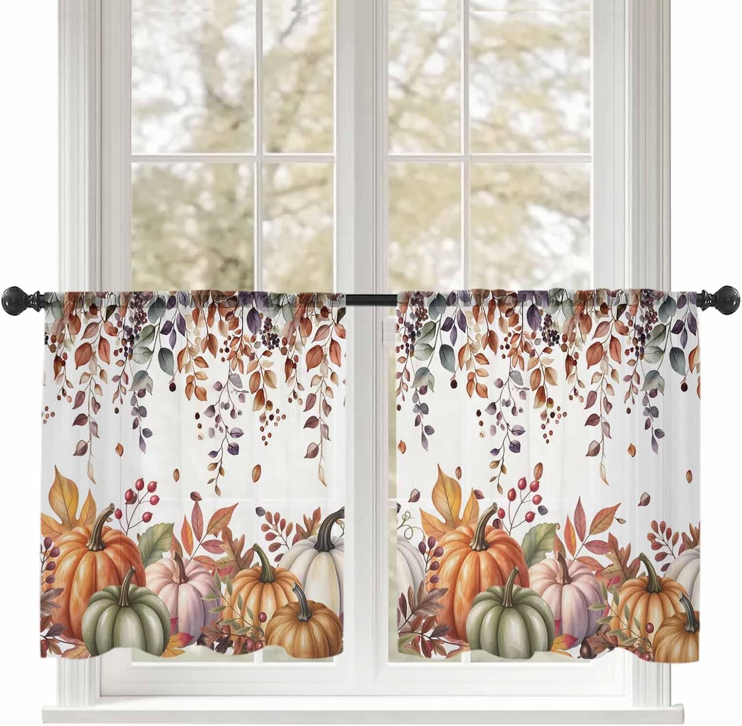 Fall Semi Sheer Curtains - Effortless Installation1.Designed for convenience, these short curtains for small window are easy to install and change, allowing you to update your decor with minimal effort.2.The 3" rod pocket header allows the nursery curtains to hang easily on any standard curtain rod, so you can quickly transform your space without complicated installation.Sheer Curtains - Create a Luxurious Ambiance1.Made from high-quality chiffon fabric, these basement window curtains not only add a touch of luxury, but also create a light and airy feel, making your space feel more open and welcoming.2.Elevate your home's decor with these beautiful sheer curtains, designed to bring sophistication and elegance to any room such as bedroom/bathroom/living room/kitchen/office.3.Perfect for decorating during the festive season, these extra long curtains will add a touch of elegance to any room. Whether you want to create a cosy atmosphere for Christmas or a spooky touch for Halloween, these kitchen curtains are sure to impress.Curtain Sheers - Perfect Balance of Natural Light and Privacy1.The soft, translucent fabric of the curtains & drapes gently filters sunlight, casting a warm and inviting glow in your room, diffusing harsh sunlight and reducing glare, creating a soft light that is easy on the eyes.2.The chiffon fabric of the living room curtains blocks the view outside but doesn't completely block it, giving you the privacy you need while still letting you enjoy the beauty of the outdoors, making window treatments a practical choice for any room in your home.Curtain Sheers - Holiday GiftsLooking for the perfect gift Our voile farmhouse curtains are a ideal gift choice for any occasion. Whether it's a warm-up party for a new home, a birthday celebration, or a gathering during the holiday season, these curtains for living room are sure to delight your loved ones.