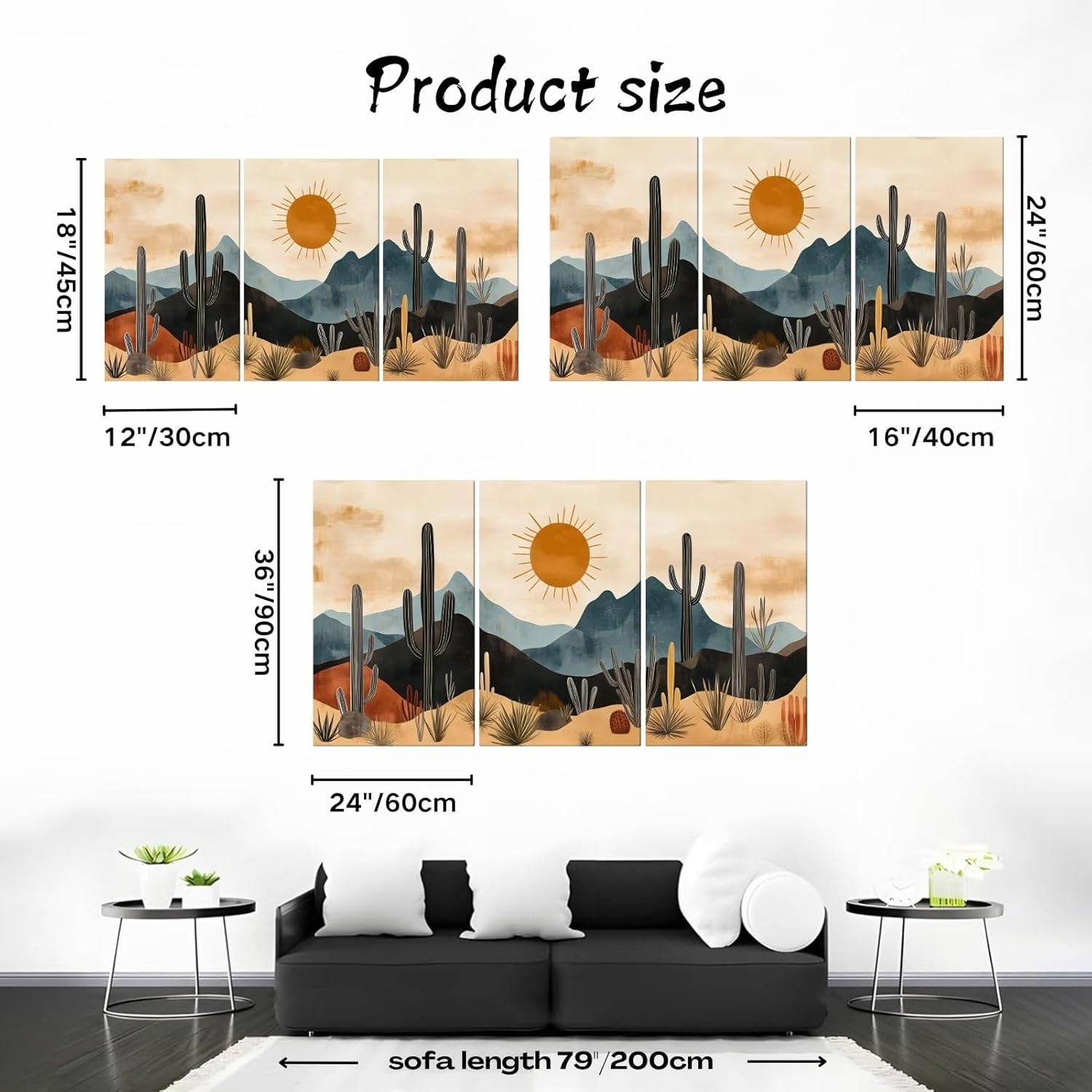 Product Introduction: This exquisite desert cactus canvas painting is an excellent choice for your home decoration. It perfectly combines the magnificence of nature with the beauty of art, bringing a unique visual enjoyment to your space Dimensions: 12"x18" canvas wall art set of 3 16"x24" canvas wall art set of 3 24"x36" canvas wall art set of 3 Material: 1. With ultra-high resolution clarity 2. A quality canvas that can be used for a long time Type: Hanging Decoration Set of 3 Desert Canvas Wall Art; 1 x Installation Kit Notes: 1. Due to manual measurement, please allow 1-3% size difference, please make sure you don't mind before bidding 2. This is a canvas print, not hand-painted, there are no differences in the product itself, but due to different monitors, each user may see slightly different colors