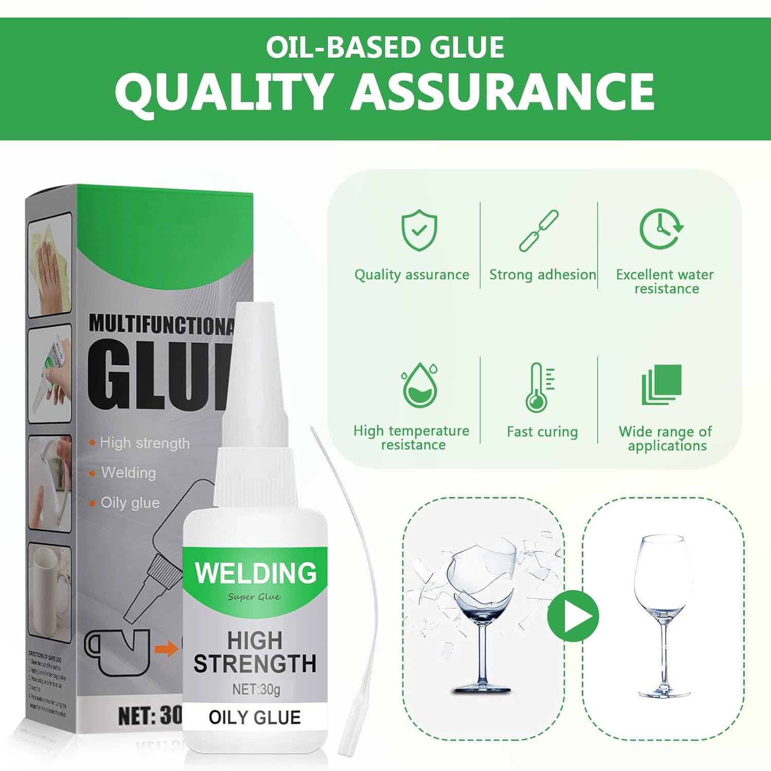 Specification: Type: oil-based welding adhesive. Net weight: 30 g. Shelf life: 3 years. Storage: Store in a cool and dry place. Suitable materials: plastic, ceramic, glass, metal, wood, leather, etc. Features: 1. The special oil-based formula gives the leather adhesive excellent water and weather properties after curing and does not fail due to environmental influences. 2. This oil-based ceramic adhesive is characterised by a welding adhesive-like adhesion that far exceeds that of conventional adhesives. It forms a strong and permanent connection within seconds, restores the original state of broken objects and prevents cracks or peeling even after many years of smoke. 3. The tapered nozzle allows precise dosage of the adhesive and prevents overflow, waste and dirt. The flexible bottle body ensures even squeezing and is easy to use. 4. This universal, extremely strong adhesive eliminates the need to prepare multiple adhesives for different materials. One bottle is enough for bonding most everyday materials, including metal, plastic, wood, ceramic and leather. Smoke instructions: 1. Clean and dry surface. 2. Apply precisely with the applicator. 3. Squeeze parts together and hold them briefly. 4. The connection is fixed within a few minutes. Pack list: 2 x universal waterproof super adhesive.