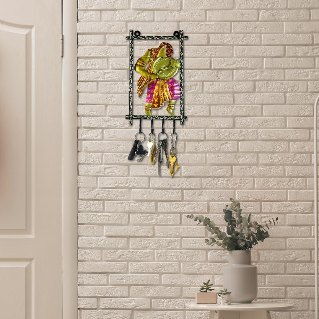 Enhance your wall décor while keeping your space tidy with the HASTVIKAS Decorative Key Stand. This handcrafted metal key holder showcases a beautifully painted figures in traditional attire, framed in an ethnic border bringing color, culture, and function into your home. Designed with strong hooks, it helps you neatly organize keys, lanyards, small tools, or everyday essentials at your entryway or workspace. Compact yet eye-catching, it fits well in hallways, living rooms, or even pooja corners, adding a handmade, rustic touch wherever it’s placed. Made in Jodhpur, Rajasthan by skilled artisans, this key stand is a perfect fusion of tradition and utility making it a standout gift for discerning art lovers or those setting up a new home.