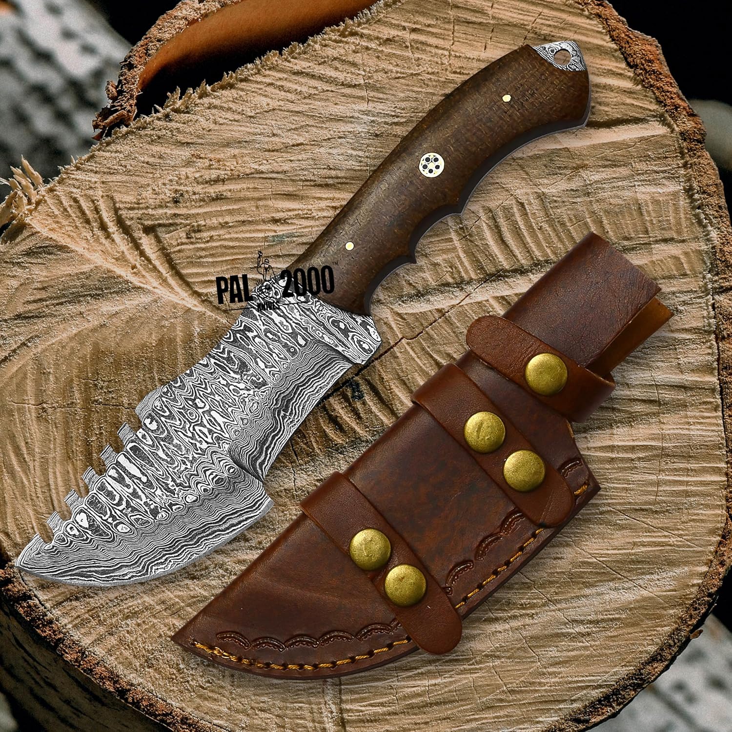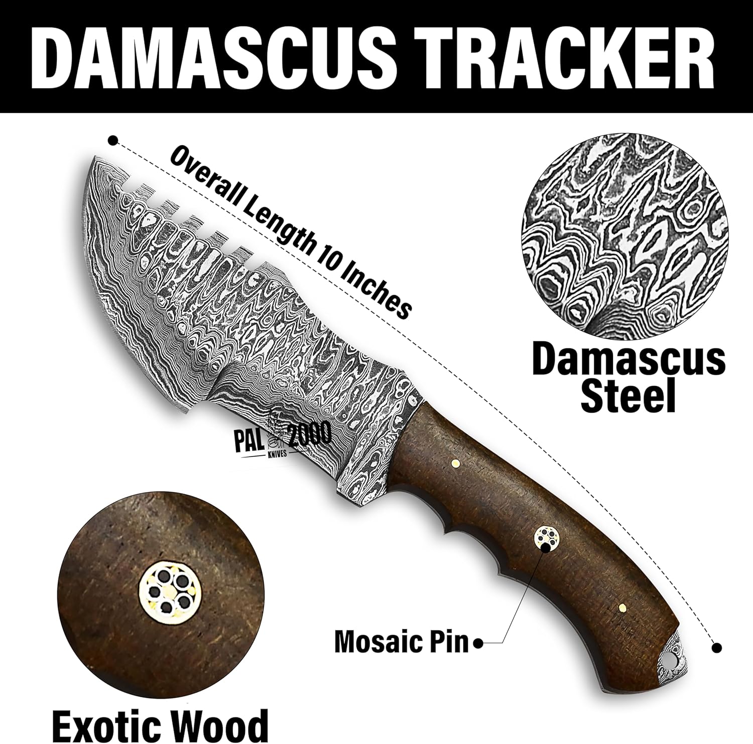 Custom Made, Hand Forged Damascus Steel Blade Tracker Knife Ladder Pattern Full Tang, Fully Functional, Sharp Edge, Perfect Grip, Balanced, Quality. MEASUREMENT Total length: 10 Inches Blade Length: 5.4 Inches Blade width: 2 Inches Handle Length: 4.4 Inches Handle Material: Beautiful Exotic With Amazing art on it Handmade Durable Leather Sheath Included DAMASCUS STEELMAKING: Our Damascus article is a Double-edged blade so that it fits both left-handed and right-handed persons. The blade is folded 5 times starting from 11 layers Of 1095 and 15N20 giving approximately 352 Layers in this awesome Pattern. WILL NOT RUST WITH PROPER CARE: Your article will last you for years with the proper care. Keep it dry, oil the article blade when not using for a long time. vegetable oil or any lubricant Oil after washing. Do not put the Knife into the Sheath to store for a Long time without oil. BEST FOR CUTTING - SLICING - MINCING DICING: our articles can easily handle your daily kitchen tasks - designed for cutting, slicing - mincing, and dicing of fruit - vegetables, and meat. The classic look, ergonomic handle, and ease-of-use design that you will come to rely upon it. We Are Making All Type of knives Like, - Knife BUYING: You must be sure18+ of age and you can legally purchase and own an Article and will use it responsibly.Our articles have been built with Perfection in Mind. Ideal Multipurpose Cutlery Gift Christmas, Weddings, Birthdays, for Home Cooks, Professional Chef’s, Culinary Students, and more. Great piece of art for a perfect gift knife as well as fully functional.