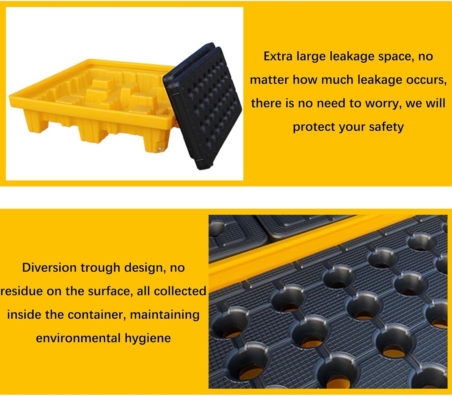 Pallet Spill Containment Platform Stackable Polyethylene Oil Drum with Drain Detachable Modular,Introducing our Stackable Oil Drum Containment Pallet, designed for optimal spill management and safe handling of hazardous materials. Constructed from high-quality polyethylene, this pallet features a robust rib design that enhances impact resistance, making it the perfect solution for your storage needs. The anti-slip textured surface increases friction, ensuring that stored items remain stable during transport and storage, which helps minimize the risk of spills. In the event of a leak, our innovative design channels liquids directly into the designated catchment area, effectively safeguarding the environment and simplifying cleanup processes. This makes our containment pallet an essential asset for any facility handling hazardous materials. **Specifications:** - **Product Name:** Spill Containment Pallet - **Material:** Polyethylene - **Color:** Yellow and Black - **Available Sizes:** - A: 68x68x10CM, Leakage Volume: 20L, Static Load: 400KG - B: 67x67x10CM, Leakage Volume: 30L, Static Load: 300KG - C: 67.5x67.5x15CM, Leakage Volume: 43L, Static Load: 200KG - D: 67.5x67.5x15CM, Leakage Volume: 43L, Static Load: 500KG - E: 72x72x15.5CM, Leakage Volume: 25L, Static Load: 500KG, Dynamic Load: 300KG **Key Features:** - Leakproof design for effective environmental protection - Non-slip surface enhances safety during use - Sturdy construction ensures reliable performance - Ventilated for improved airflow - Made from wear-resistant materials for durability - Strong load-bearing capabilities suitable for various applications **Packing List:** 1 x Spill Containment Pallet Please note that the listing includes only the spill containment pallet; other items shown are for illustration purposes only. Improve your storage solutions with our reliable spill containment pallets, ideal for industrial and commercial settings where safety and compliance