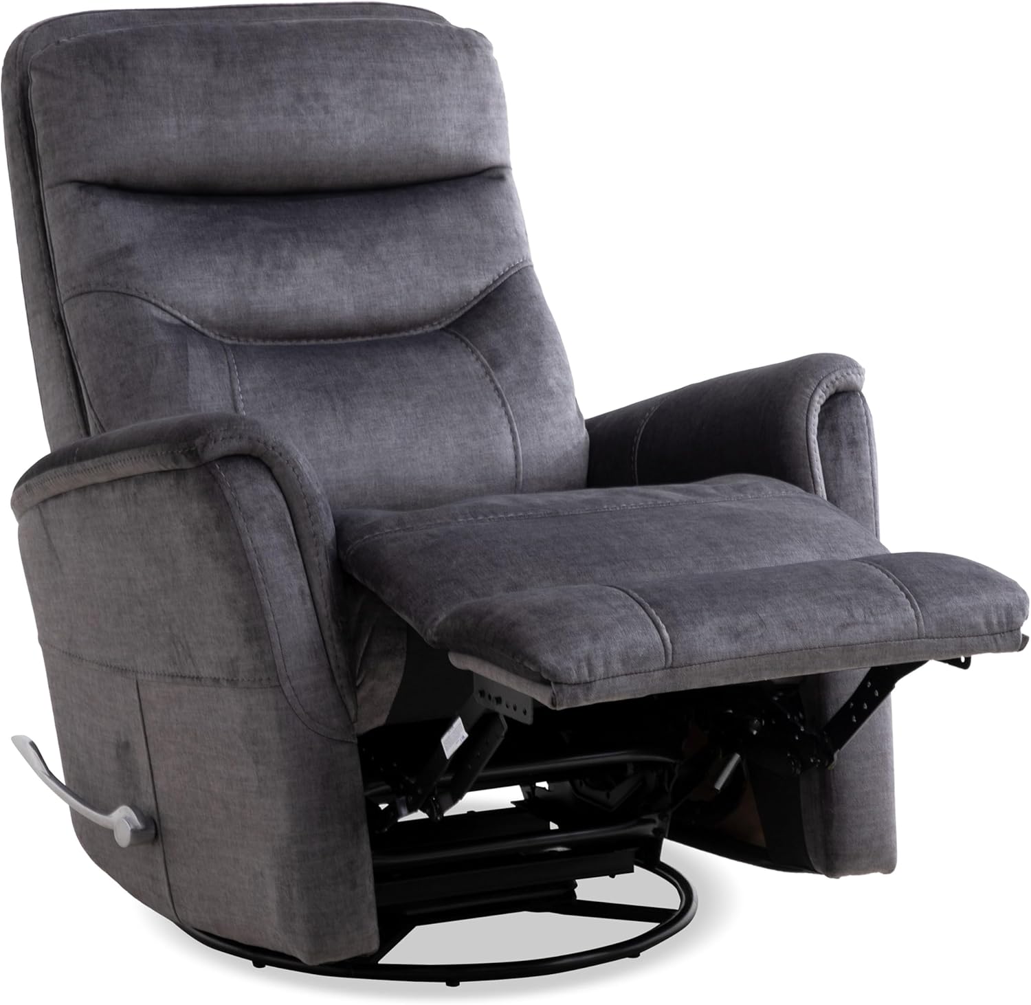 The Gemini Capri Charcoal Swivel Glider Recliner Two Pack brings comfort and style together, making it ideal for nurseries, living rooms, or reading nooks. Crafted from 100% polyester fabric, these chairs offer a soft, durable surface that is both easy to clean and designed to withstand everyday use. The charcoal color provides a versatile, neutral tone that complements various decor styles, blending seamlessly with contemporary or classic interiors. Each recliner chair features a smooth swivel mechanism that allows for a full 360-degree rotation, making daily activities, such as nursing or relaxing, more convenient without needing to reposition the entire chair. Additionally, the gliding motion promotes gentle, soothing movement, perfect for calming infants or enjoying a cozy moment of relaxation. The reclining function enhances comfort by allowing users to adjust the chair’s position to their preferred angle, offering support from upright seating to a nearly flat pose for rest or naps. These recliner chairs provide substantial cushioning for both back and seat areas, ensuring sustained comfort during long periods of use. - This set includes two chairs that are well suited for dual nursery setups or additional seating in a shared space where comfort should not be compromised, making it a practical choice for growing families or multi-use rooms. The sturdy construction supports a considerable weight, while the compact size fits well in smaller areas without sacrificing seating quality or ease of access. Easy to assemble and maintain, the materials used are designed for day-to-day wear and care, with spot cleaning recommended to preserve the fabric’s appearance. Whether used as a comfy reading chair for adults or a dedicated nursery recliner, these swivel gliders adapt well to various lifestyles. Their sleek design and reliable mechanics offer a peaceful seating experience that combines function with restful style. The Gemini Capri Charcoal Swivel Glider Recliner Two Pack makes a thoughtful addition to any home where relaxation meets practicality. This product will be delivered in its original manufacturer packaging.