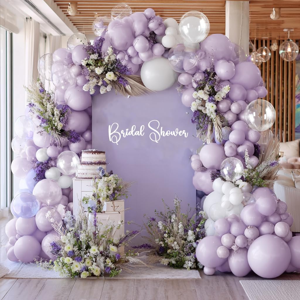 What will you receive? 5inch x 20pcs double stuffed light purple balloons(light purple in dusty purple) 12inch x 30pcs double stuffed light purple balloons(light purple in dusty purple) 18inch x 3pcs double stuffed light purple balloons(light purple in dusty purple) 10inch x 5pcs single layer clear bobo balloons 18inch x 2pcs single layer clear bobo balloons 12inch x 30pcs double-layerd light white balloons 5inch x 20pcs double stuffed white balloons 18inch x 3pcs double white pearl balloons 10inch x 5pcs clear bobo/transparent bubble balloons 18inch x 2pcs clear bobo/transparent bubble balloons 2 roll balloon garland strip (16ft) 2 roll balloon glue point (100pcs glue point) 2 roll curling ribbon (33 ft) How to make a garland? 1.Blow up balloons with a balloon pump then tie knots, recommend blowing up different sizes of latex balloons to get an amazing look to your garland. 2.Measure and cut the balloon strip to the desired length, leaving extra on each end for hanging the decoration later. 3. Pull the balloon knot through the stripped hole, skip a hole if balloons are too tight. 4. Make it more gorgeous looking, add some eucalyptus, curling ribbon, flowers, leaves, tulle, and more. Last step: Watch YouTube "how to make balloon garland" to learn more about pastel themes balloons garland style. Warm Tips 1. Versatile party themes balloons don't need to knot the outside one, just need to knot the inside one(please do not draw out the inside one).And we recommend use a hand held pump when inflating the small double stuffed balloons. 2.Please inflate all balloons 85% full, or easy pop,avoid sunburn, over heat, pointed object and excessive friction. 3. Due to automatic packing system, please kindly note that any holes or popped balloons within 1-3 pcs for every 100 pack latex balloons for party is a normal phenomenon