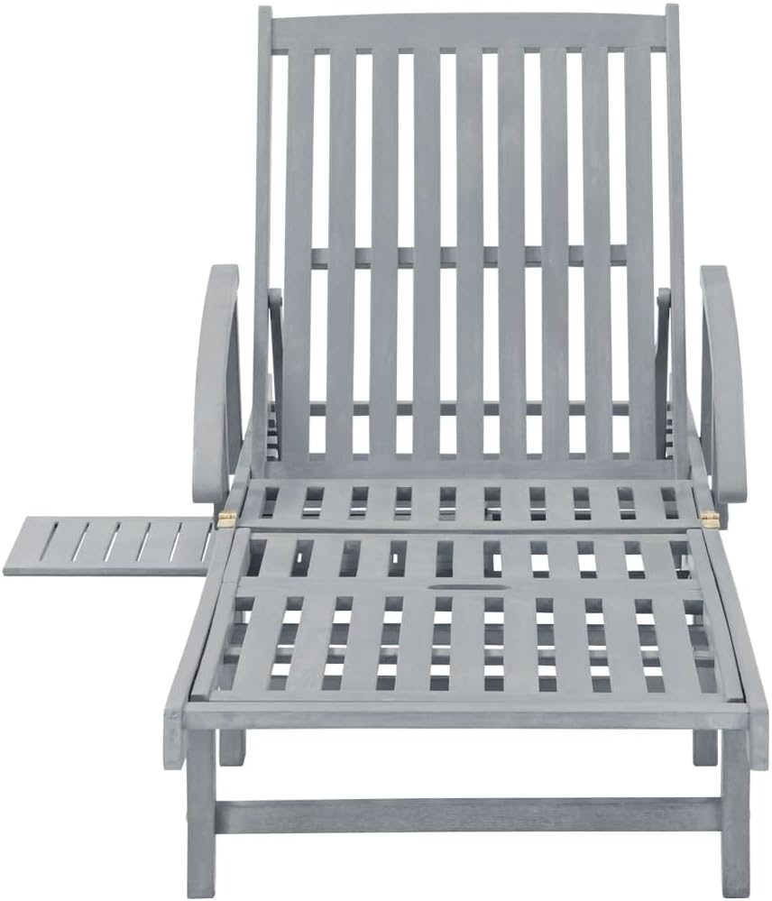 Relax and take a load off in your garden or patio on this comfortable wooden sun lounger! You can spend a relaxing afternoon in your own outdoor space. It is perfect for a pool, balcony, garden, etc.This outdoor sun lounger is made of solid acacia wood with a gray wash finishing, making it sturdy and stable. The backrest and footrest are adjustable, and you can lock the lounger into the desired position. This garden sun lounger can be easily moved around the house with equipped 2 wheels. The sunbed features a convenient pull-out table, to place your phone, sunglasses, drink and other small items. The cushion adds extra comfort for you while lounging. Each cushion features two sets of ropes so that you can fix it on the sun lounger tightly.Note: In order to extend the life of your outdoor furniture, we recommend you to protect it with a waterproof cover.Color: GrayColor of cushion: BlackMaterial: Solid acacia wood with a Gray wash finishMaterial of cushion: Fabric (100% polyester)Dimensions: 78.7" x 26.8" x 11.8"/33.9" (W x D x H)Dimensions of cushion: 78.7" x 23.6" x 1.2" (L x W x T)Assembly required: YesDelivery contains:1 x Sunlounger1 x Cushion