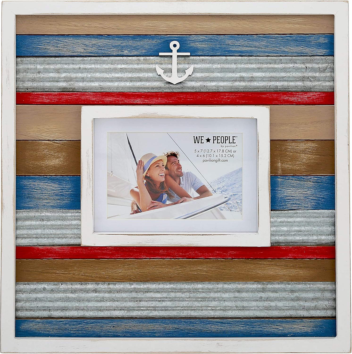 Add a touch of nautical fare to your lake-themed home décor with this excellent boat photo frame. This textured wood and the galvanized finished frame are the perfect way to display your favorite lakeside photos. The decorative frame holds one 4" x 6" horizontal photo with the included cream-colored mat or one 5" x 7" horizontal photo without the mat and features a cute embossed anchor icon above the image. You can create a unique seascape wall display using the included sawtooth hanger. Swap out your photos with the easy-to-use, high-quality plastic turn tabs. The picture frame includes a durable glass front to protect your summertime memories for years. Product Dimensions: Approximately 14" x 14."