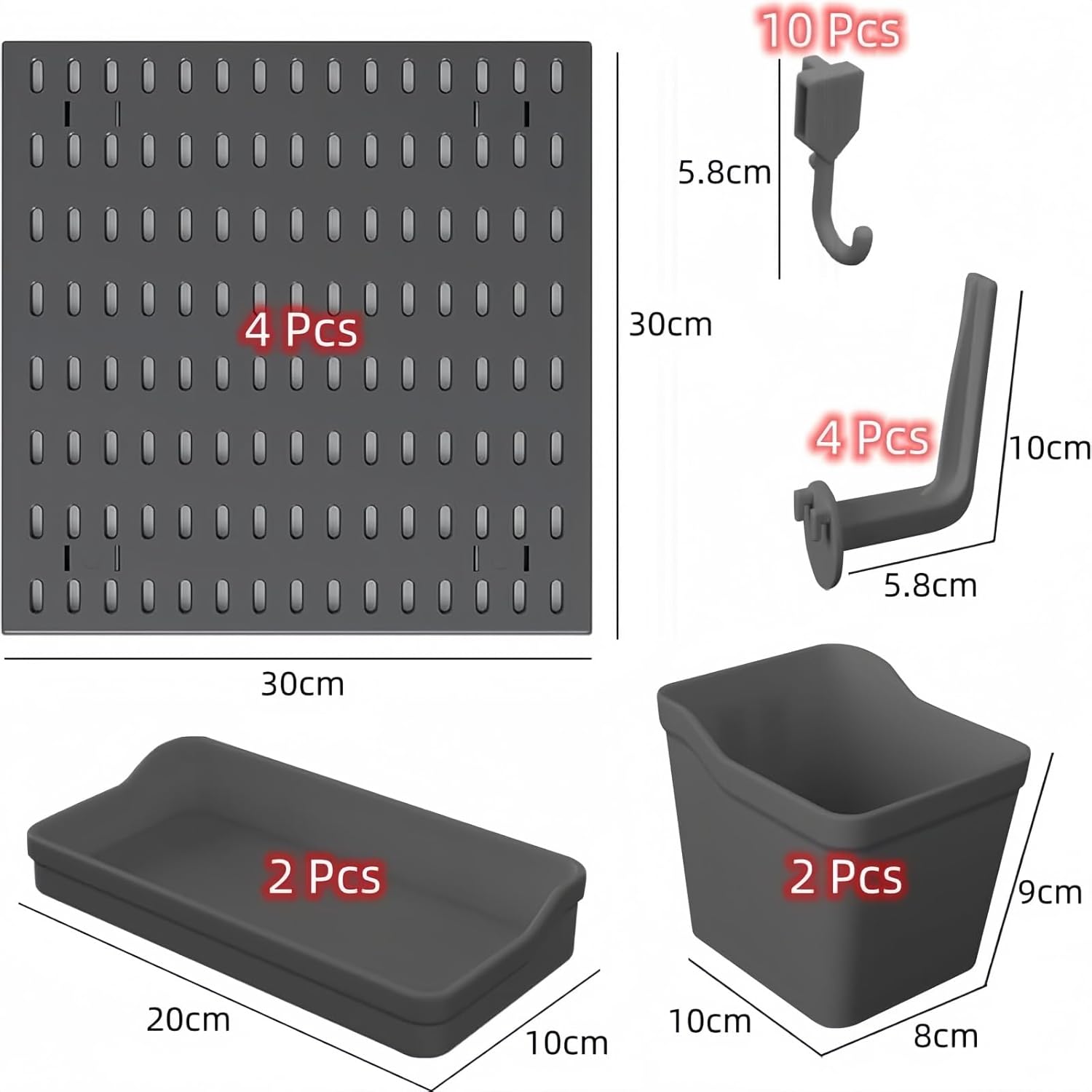 FeatureOur pegboard combination set includes 4 square pegboards measuring 30cm x 30cm each, 2 storage boxes measuring 10 x 8 x 9cm each, 2 medium shelves measuring 20 x 10 x 3.9cm each, 10 small hooks, and 4 large hooks. This is a comprehensive set that caters to all your storage needs.