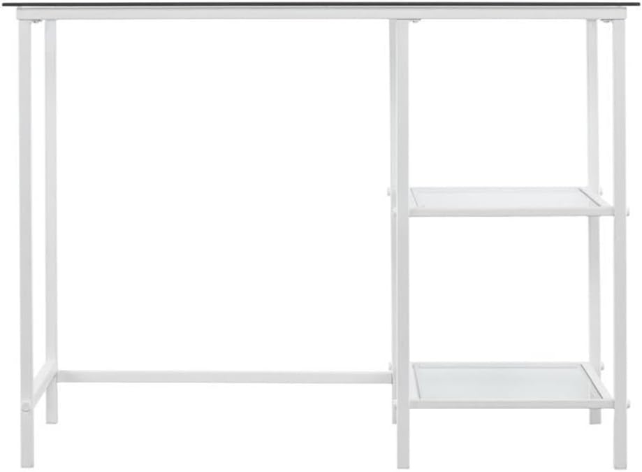 Put your workplace on the straight and narrow with this contemporary metal and glass desk. Sturdy white metal frame combines with shatter-resistant tempered glass for ample work and shelving space. Sleek and simple, this versatile workstation easily multitasks as a vanity desk in the dressing area, coffee bar in the kitchen, or crafting zone in a workroom.Features:- Clean, open frame with wide-beveled glass desktop- Broad workspace and 2 fixed shelves- Sleek, minimalist look- Home office, bedroom, or open concept living area- Contemporary to transitional style- Fresh whiteSpecifications:- Product Dimensions: 30.25" H x 42.00" W x 19.00" D- Product Weight: 43 lbs- Weight Capacity: (Desktop) 40 lbs, (Each shelf) 20 lbs