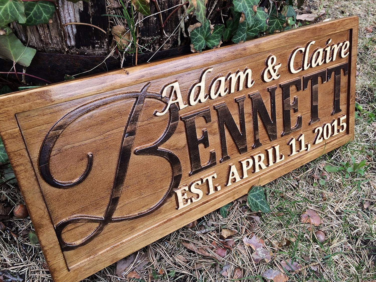 You're looking at a personalized wood sign carved from 3/4" premium quality solid pine and made using two-tone stain that's finished with sealer. Each sign is designed with your custom text in the layout shown and comes equipped with a sawtooth hanger for effortless hanging. Notice the 3D lettering and images that pop out from the background; Natural characteristics of the wood are showcased in each piece. The knots and wood grain vary from piece to piece and are not considered a flaw or defect in the sign. It simply shows the natural characteristics within the wood. We do not recommend placing outdoors in the direct elements. Exposure to moisture, sun, and wind will cause damage over time. If using outdoors, protection from elements is strongly recommended. Long-term outdoor use is at the buyer’s risk. Signs damaged from outdoor exposure are not eligible for returns, refunds, or replacements. Message seller if you have any questions or special requests. Thank you!