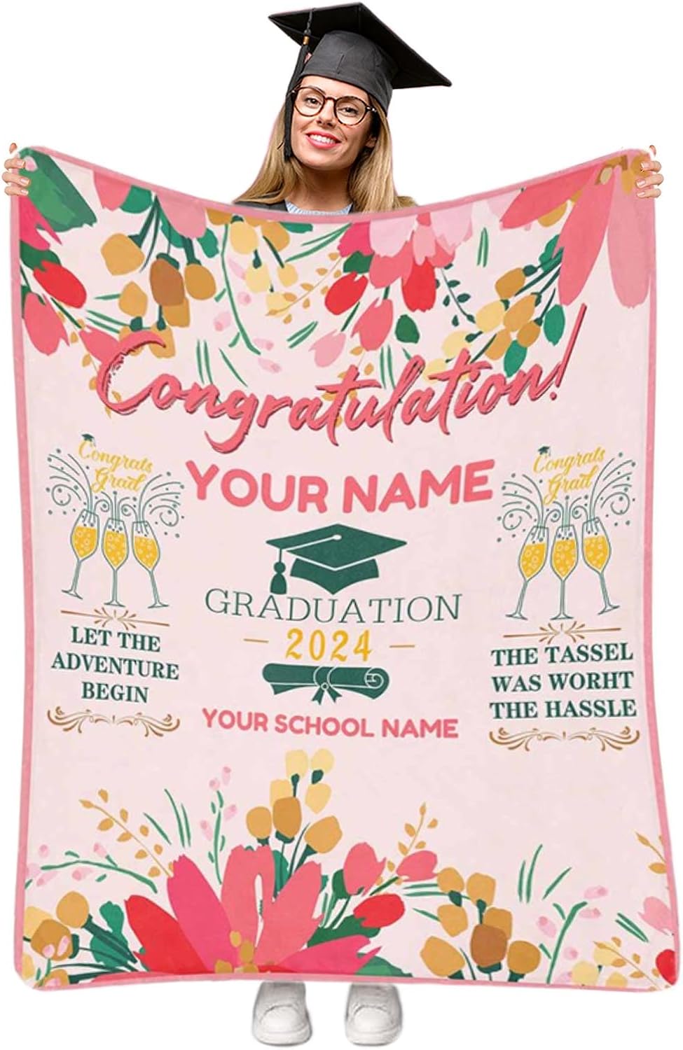 Celebrate the Class of 2024 with our Custom Graduation 2024 Throw Blanket! This cozy and soft flannel blanket is the perfect way to commemorate your loved one's academic achievements. With customization options available, you can add the school name and person's name for a truly unique and personalized gift. Made with high-quality materials, this blanket is designed to be both durable and comfortable. Plus, it's machine-washable for easy maintenance! Whether you use it as a decorative piece in your home or as a warm wrap on a chilly night, this blanket is sure to bring joy and comfort. Don't miss out on the opportunity to give a thoughtful and one-of-a-kind gift to the graduates in your life!