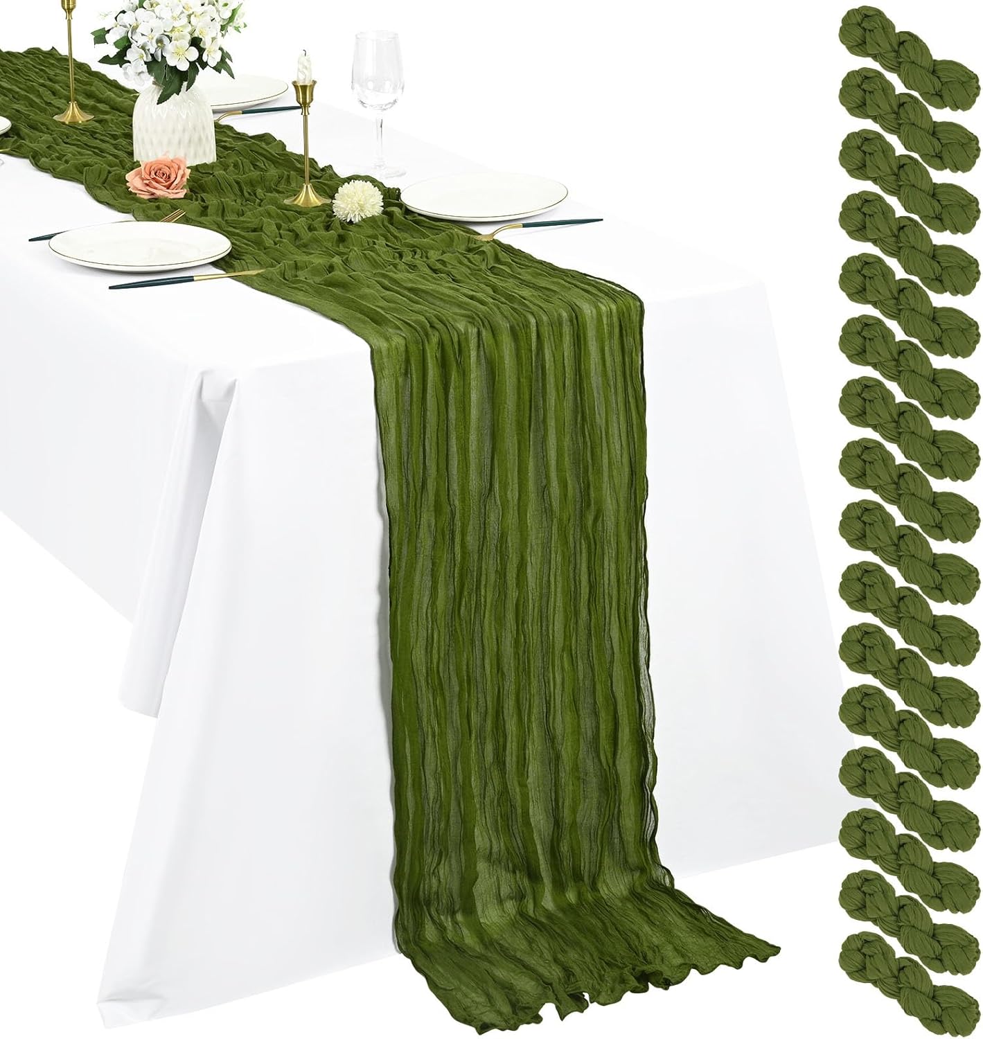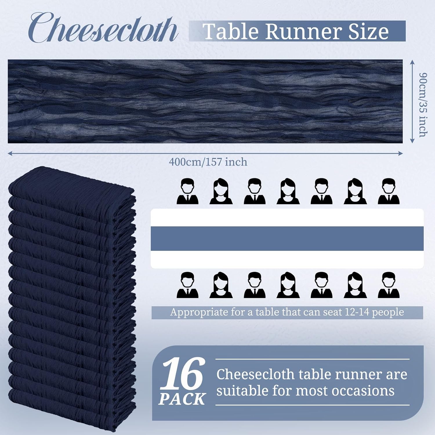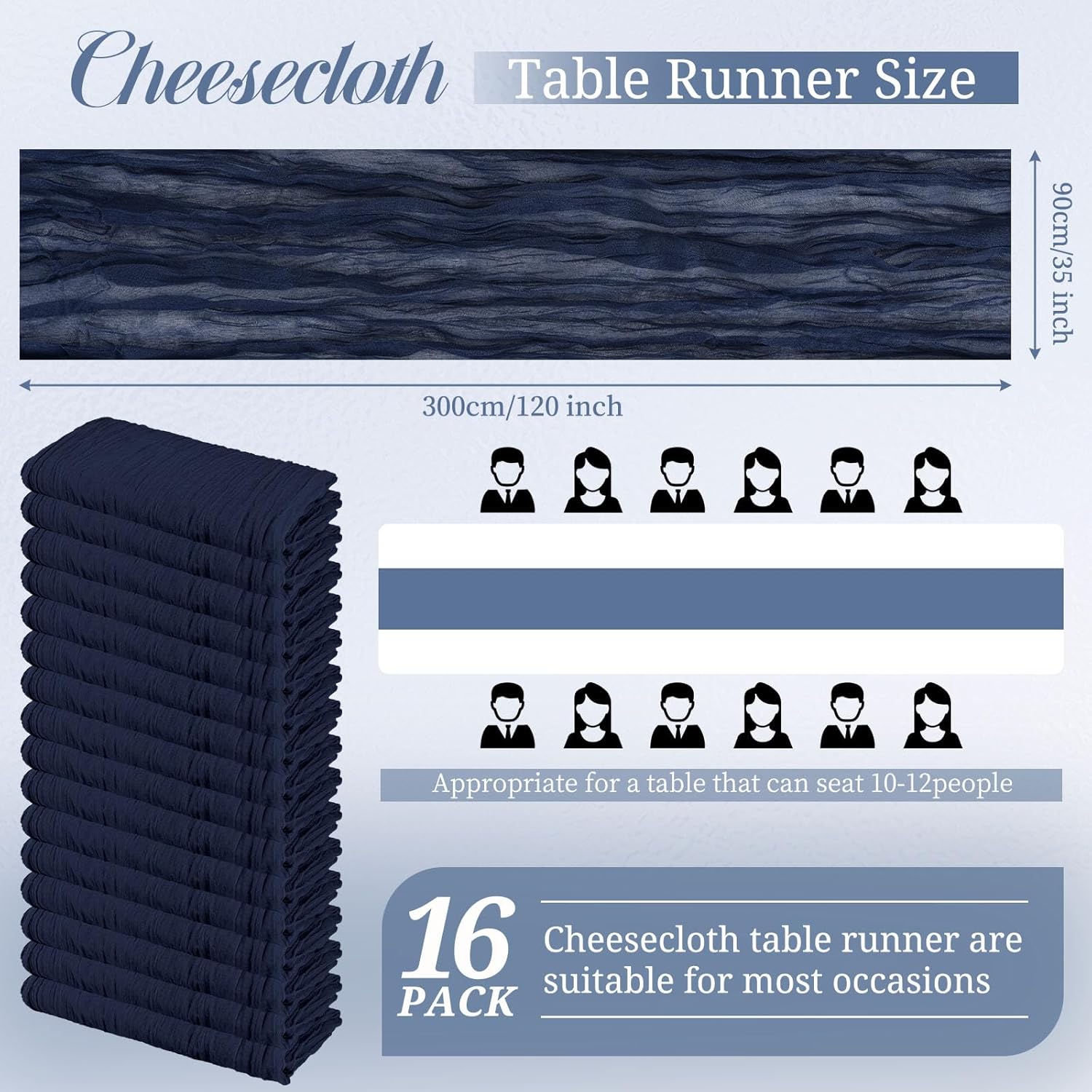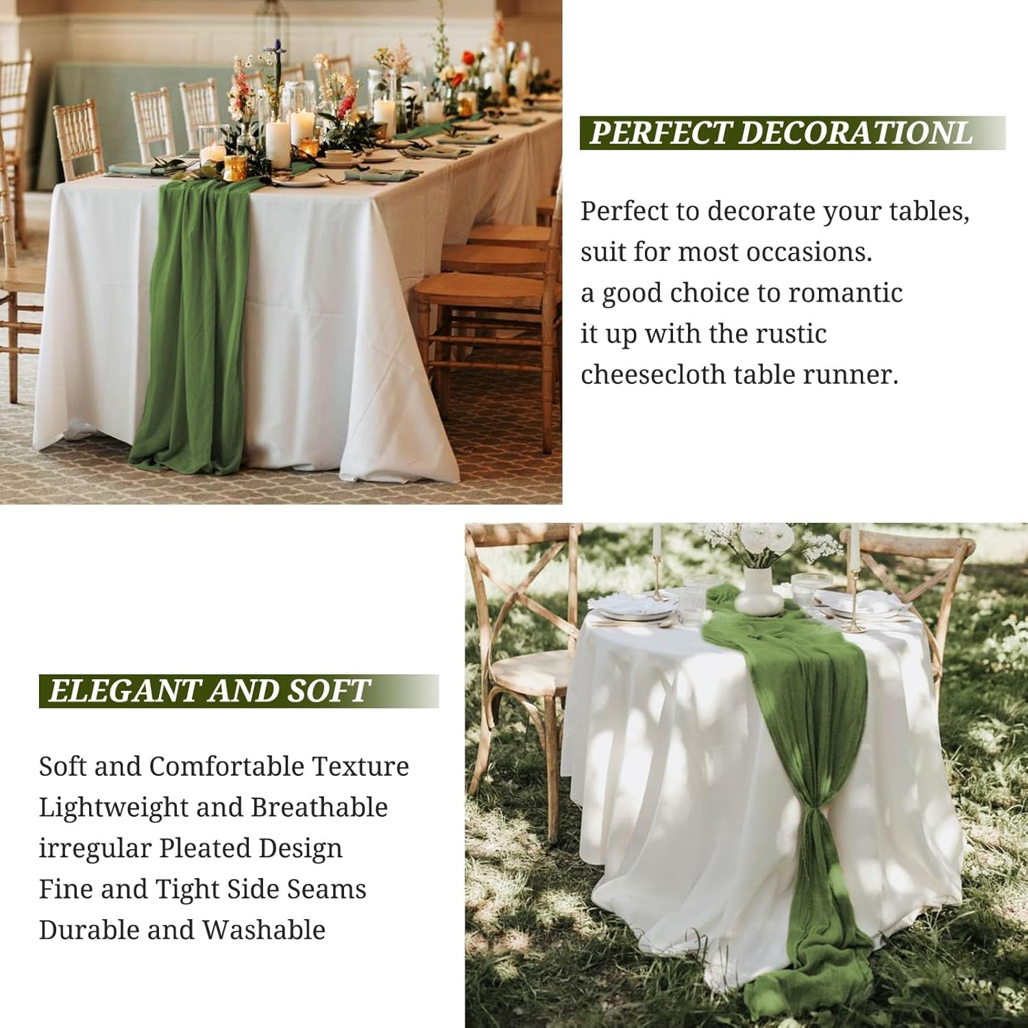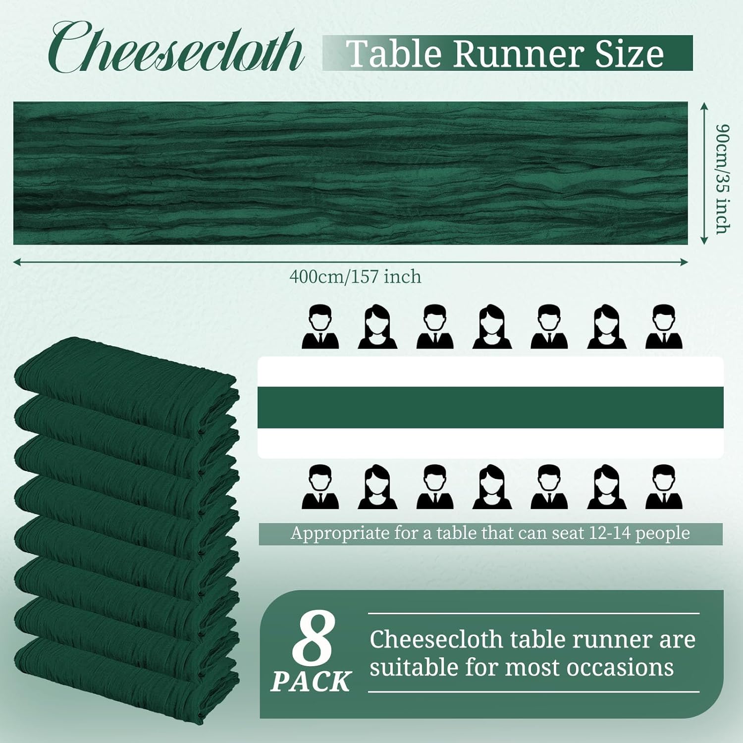 Product Description:Black Green Cheesecloth Table Runner Features:1. 16 Packs cheesecloth table runner measures 35" x 120" in size with wrinkled texture appropriate for round or rectangle tables that can seat 10-12 people. The cheesecloth table runner is long enough, drapes gracefully across your table and flows onto the floor The natural drooping feeling flows to the floor, making people eye-catching and add romantic atmosphere to your table at any event. 2. Our cheesecloth table runners feature a pleated texture design adds more vintage, rustic and aesthetic beauty. This rectangular romantic vintage gauze table runners has a rustic-elegant look and can create a welcoming, elegant atmosphere that your guests will adore.Flaunt boho chic style and rustic elegance into your home or party space with this Cheesecloth Table Runner. 3. The cheesecloth table runner can be applied for many occasions, especially for wedding table decor, wedding receptions, bridal shower, wedding arches, boho themed picnic, birthday party, graduation party, St. Patrick's Day, Valentine's Day, Easter, Halloween, Thanksgiving, Christmas and other special occasions. This romantic table runner is also a great choice to decorate your table, chairs or wedding arch.Specification:Quantity: 16 PiecesMaterial: 100% natural cheesecloth fabric.Size: 35" W x 120"L/10FtPattern: Romantic & VintageColor: BlackWash Tips:1. Cheesecloth table runners are recommended for hand wash in cold water or machine wash in a laundry bag2. Please do not iron or use hot water, do not bleach or soak for too long time.3. Lay flat or hang dry.Package Includes:16 x Black Cheesecloth Table RunnerOur Service:24hours online customer serviceIf You're not completely satisfied with your purchase simply let us knowWe will help you solve your problem well.Notes:Manual measurement, please allow slight size error.Colors may vary slightly due to different screen displays.
