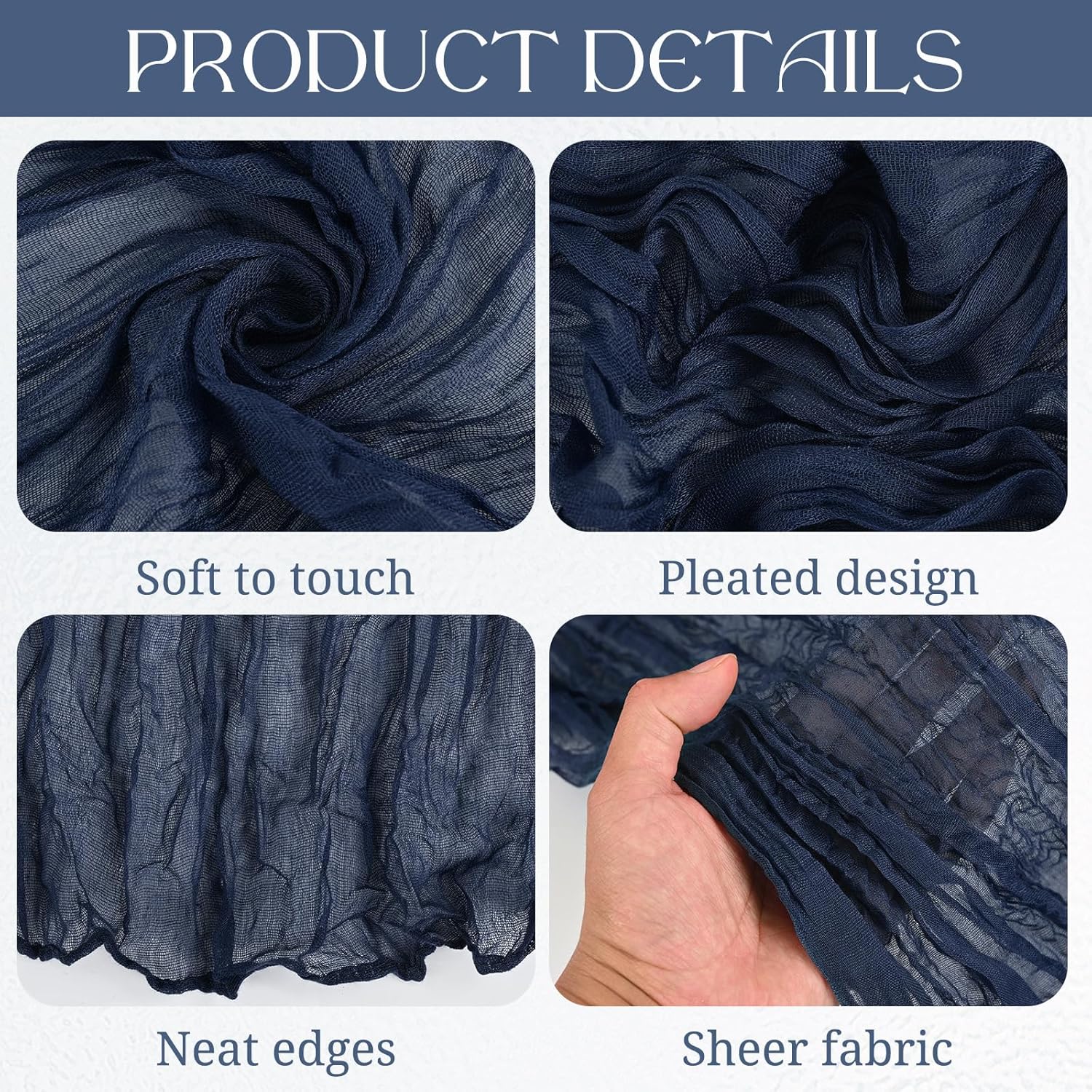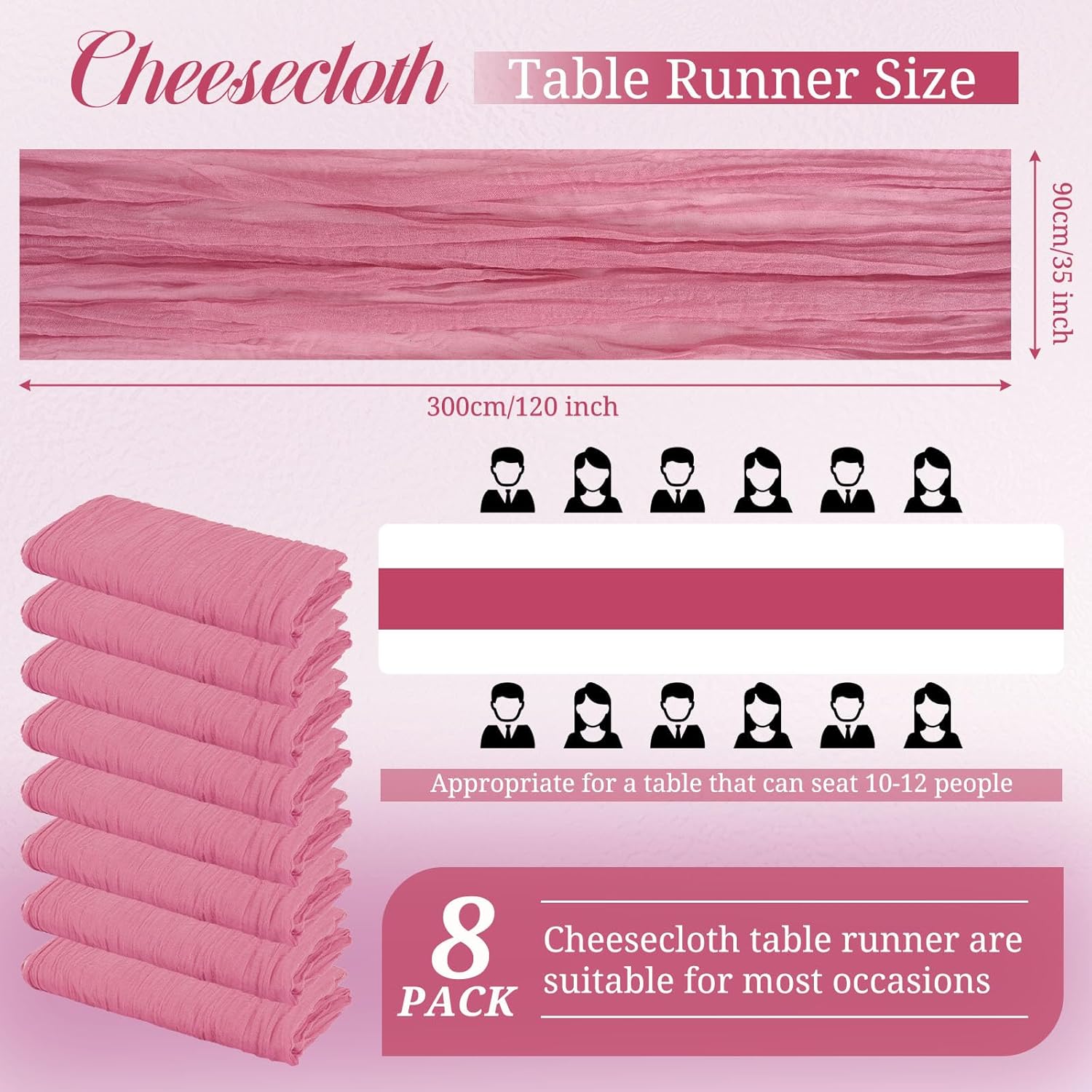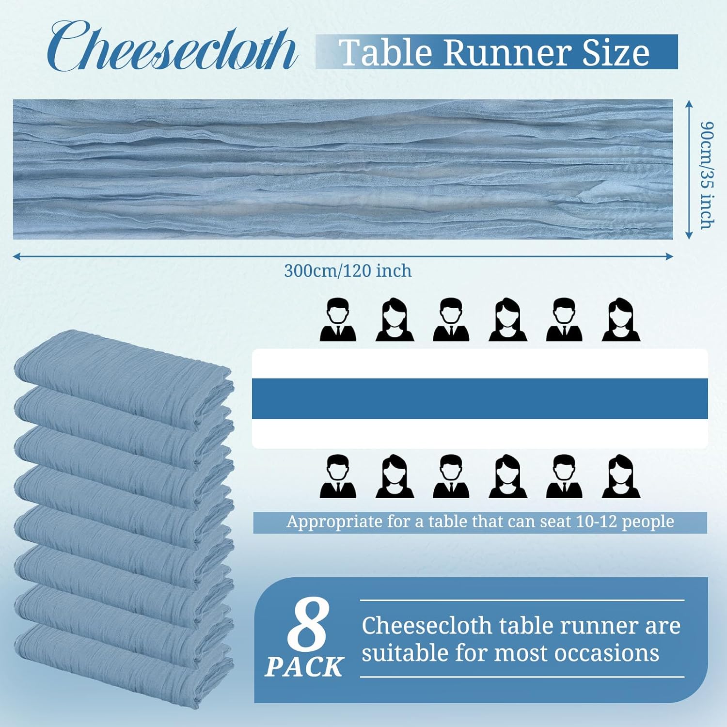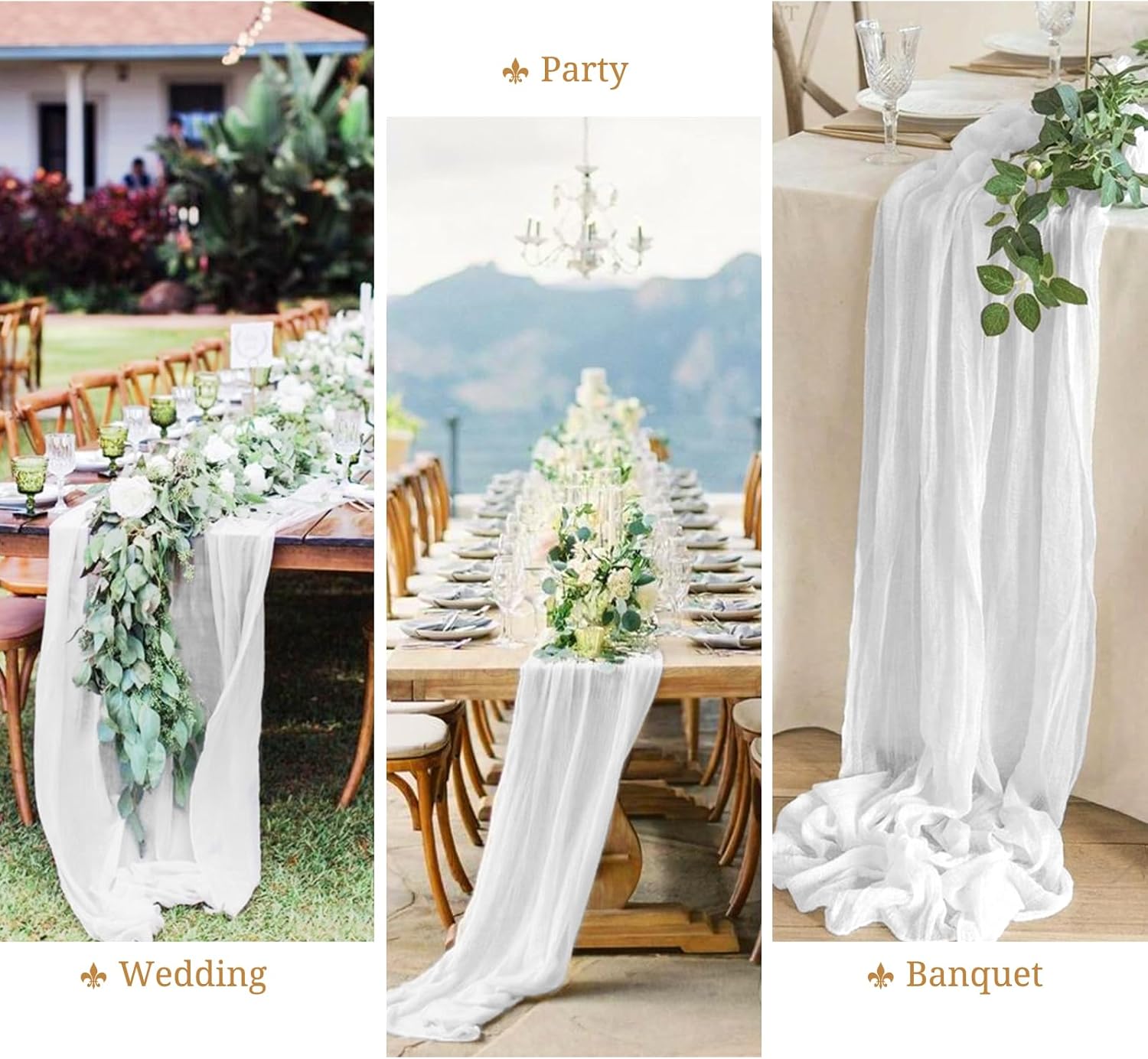 Product Description:Black Green Cheesecloth Table Runner Features:1. 16 Packs cheesecloth table runner measures 35" x 120" in size with wrinkled texture appropriate for round or rectangle tables that can seat 10-12 people. The cheesecloth table runner is long enough, drapes gracefully across your table and flows onto the floor The natural drooping feeling flows to the floor, making people eye-catching and add romantic atmosphere to your table at any event. 2. Our cheesecloth table runners feature a pleated texture design adds more vintage, rustic and aesthetic beauty. This rectangular romantic vintage gauze table runners has a rustic-elegant look and can create a welcoming, elegant atmosphere that your guests will adore.Flaunt boho chic style and rustic elegance into your home or party space with this Cheesecloth Table Runner. 3. The cheesecloth table runner can be applied for many occasions, especially for wedding table decor, wedding receptions, bridal shower, wedding arches, boho themed picnic, birthday party, graduation party, St. Patrick's Day, Valentine's Day, Easter, Halloween, Thanksgiving, Christmas and other special occasions. This romantic table runner is also a great choice to decorate your table, chairs or wedding arch.Specification:Quantity: 16 PiecesMaterial: 100% natural cheesecloth fabric.Size: 35" W x 120"L/10FtPattern: Romantic & VintageColor: BlackWash Tips:1. Cheesecloth table runners are recommended for hand wash in cold water or machine wash in a laundry bag2. Please do not iron or use hot water, do not bleach or soak for too long time.3. Lay flat or hang dry.Package Includes:16 x Black Cheesecloth Table RunnerOur Service:24hours online customer serviceIf You're not completely satisfied with your purchase simply let us knowWe will help you solve your problem well.Notes:Manual measurement, please allow slight size error.Colors may vary slightly due to different screen displays.
