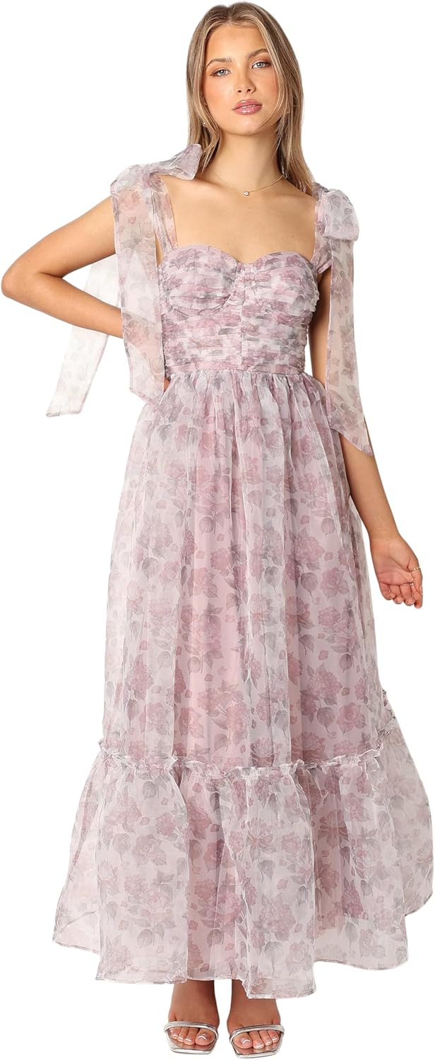 Make a statement in this dreamy dress! This midi dress features a sweetheart neckline, tie close shoulder straps, and padded cups in the bust for extra support and to top it all off, this dress is made with a lavender floral chiffon overlay for an elegant touch. Perfect for any special occasion.