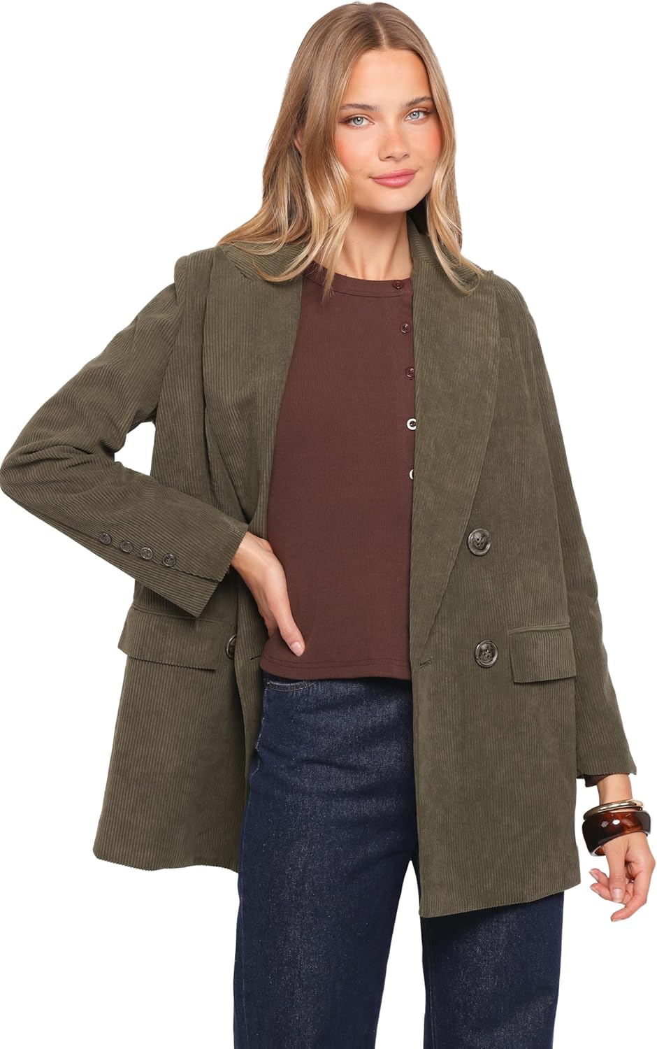 The Madi Corduroy Blazer in Olive brings effortless sophistication to your wardrobe with its rich, textured corduroy fabrication that feels as luxurious as it looks. This double-breasted design features classic notch lapels and long sleeves that create a polished silhouette.