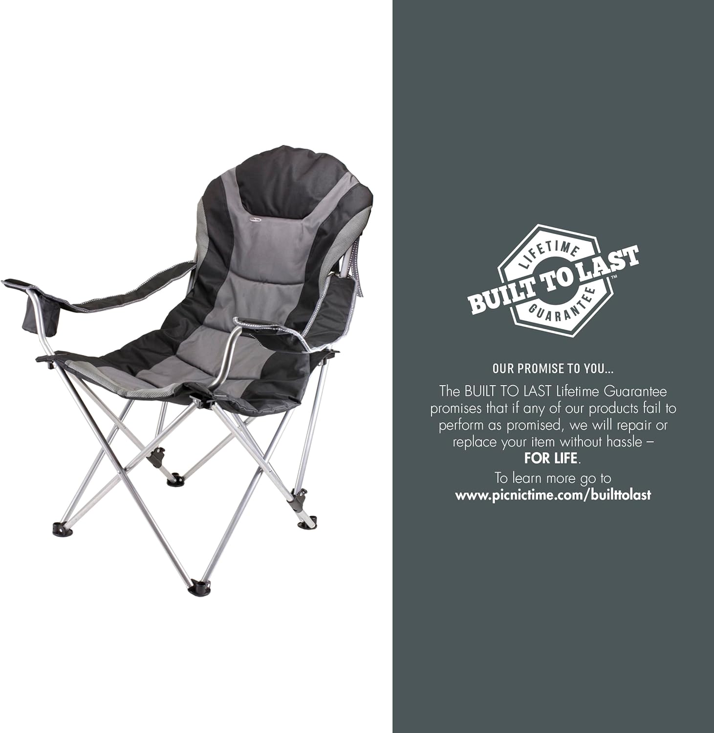 Plush, portable, and packable, the Picnic Time Reclining Camp Chair is your camping cockpit with three reclining positions, an extra-wide, padded polyester seat and armrests, an insulated drink holder, a zippered pocket, and a sturdy steel frame that folds inward to fit in a drawstring carrying bag with carrying strap. This folding outdoor portable chair is the perfect place to post up for camping, picnicking, tailgating, or at the beach.