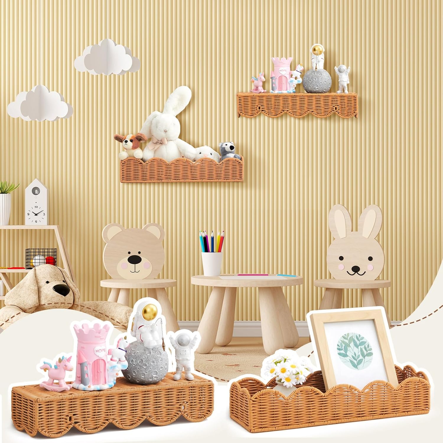 Pinkunn 3 Set Nursery Book Shelves Scalloped Rattan Wall Shelf 15.8 x 3.2 Inch Wall Mounted Plastic Floating Book Shelve, Hanging Boho Wicker Woven Shelf for Nursery Decor and Storage (Natural Wood)