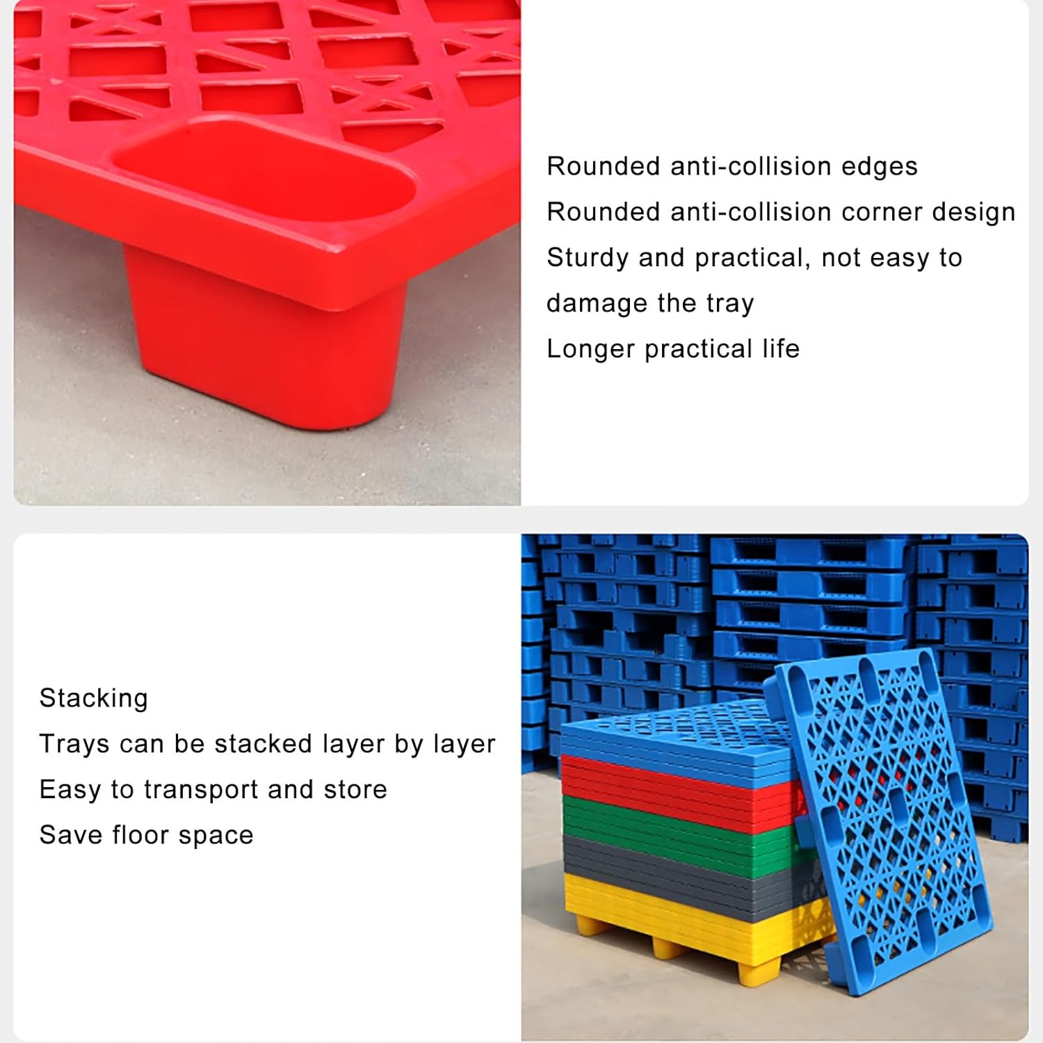 Plastic PalletsMaterial:High-density polyethylene.Color:Blue , Red , Yellow , Green , GraySize:100x80x14cm/39x31x5.5"Strong sturdy structure,strong load-bearing,Easy to moveEasy to cleanWear-Resistant,Non-Slip Safety,Long Lasting14cm/5.5" above the ground, meet the requirements of moisture-proofThe bottom grid design has easy air circulation and heat dissipationUse Scenario: Kitchen, Balcon, Supermarket, garages, basement, storage, rooms, manufacturing, transportation facilities, other industrial environments, Industry, agriculture, landscaping, camping, closets and outdoor.