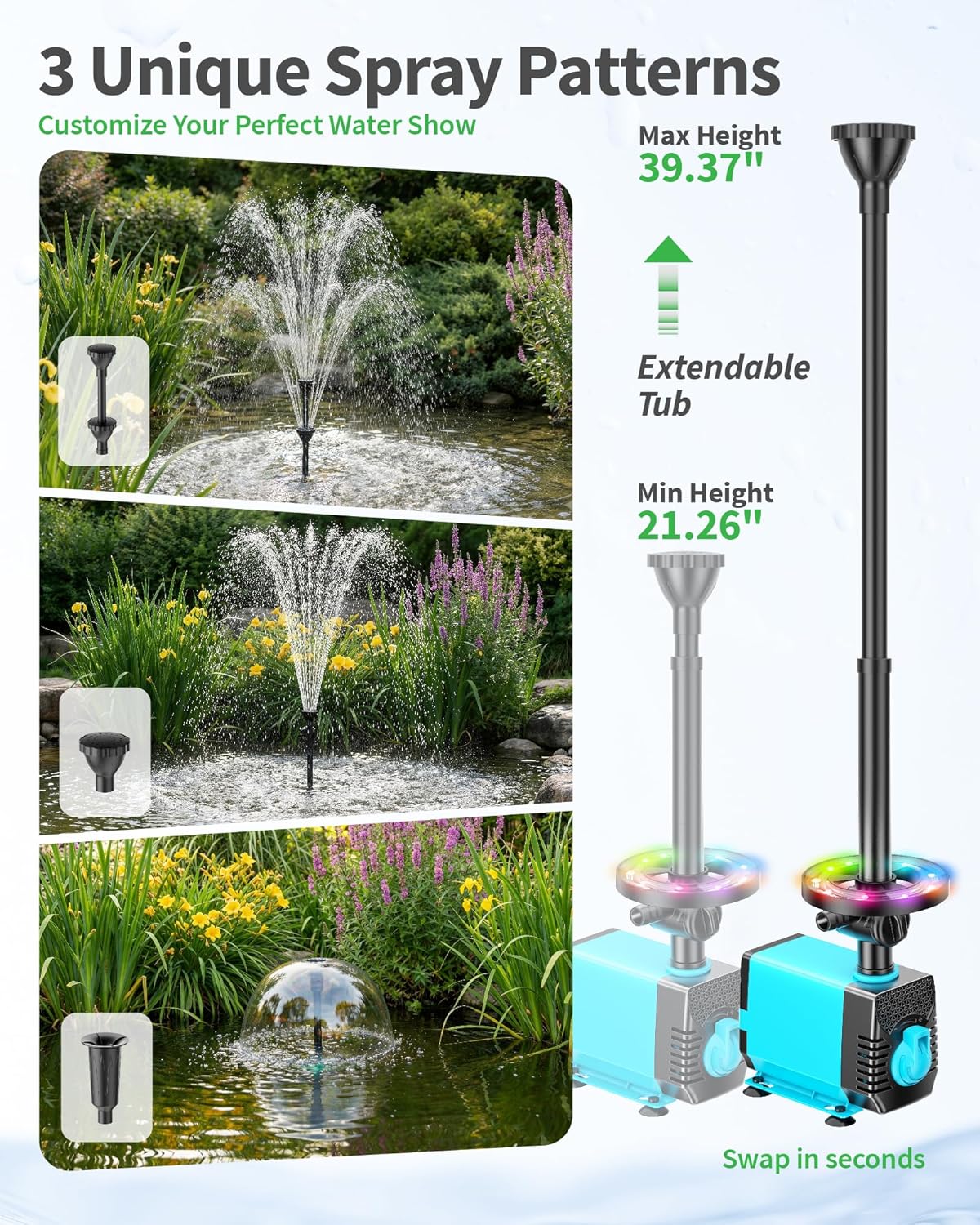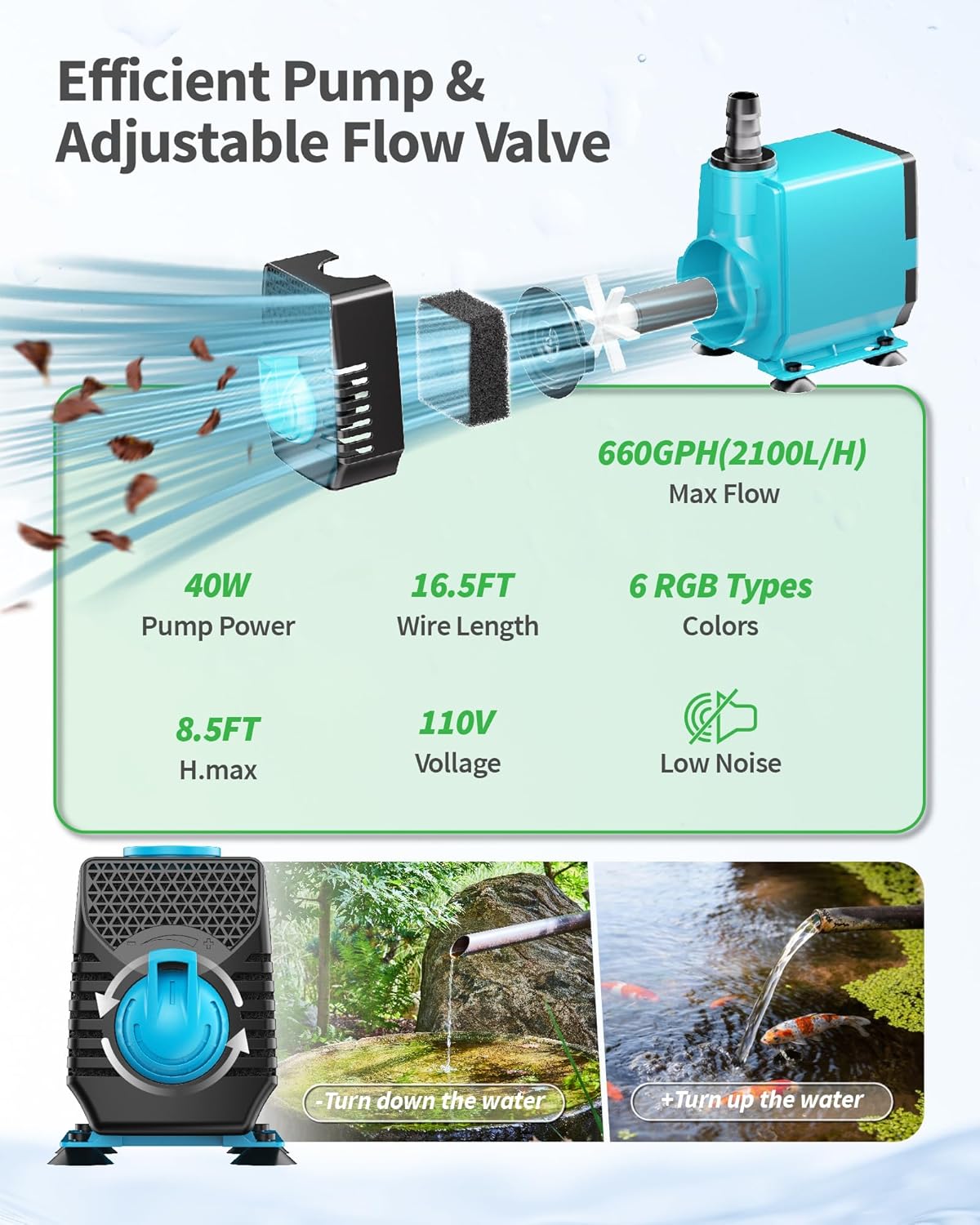 | Other Special Features of the Product | 3 Interchangeable Fountain Nozzle Patterns, 6-Level Auto On/Off Timer, 660GPH Adjustable Flow Submersible Pump, Include Pond Filter Bag for Debris Control, RGB Color-Changing Lights with Remote Control |