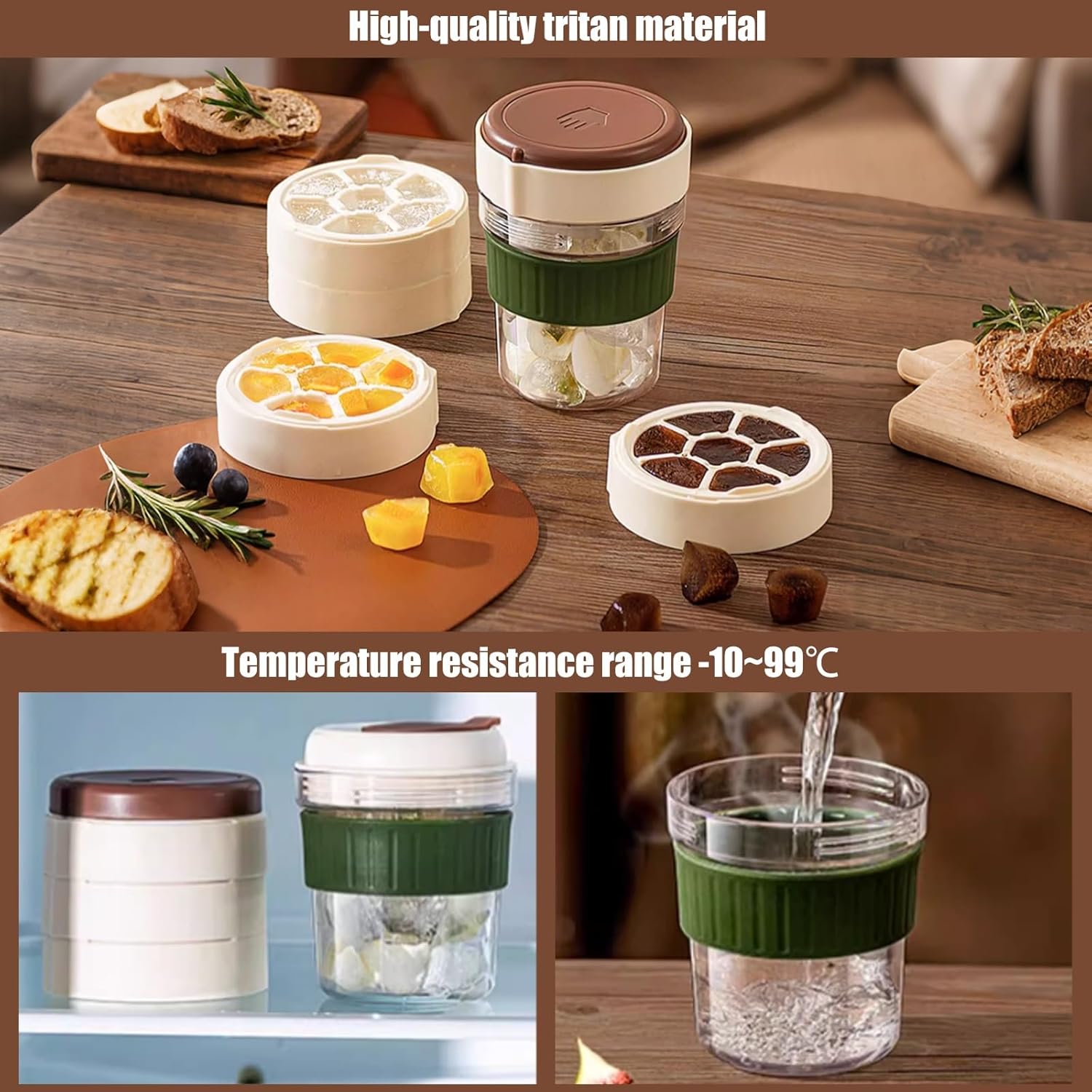 Ice tray cup made of food-grade material, it cools quickly and keeps drinks cool. It does not leak, making it perfect for cold brewing coffee or tea. This cup is well designed and can be easily put into a backpack or bag, allowing you to enjoy iced drinks anytime, anywhere.Product name:ice cube tray cup, ice cube tray bottle, ice maker cup, reusable iced coffee cup, portable ice bottle with strawCup lid material: PPPressing plate material: ABSCup body material: tritanCup lid plug/cup body sleeve/seal ring material: siliconeIce cube material: PP+TPECup size: 10.4x17 cm/4.09x6.7 inIce cube mold size: 10.4x4.4 cm/4.09x1.73inCup body: 380mlIce cube: 60ml/layerPackage includes:1x Water cup1x ice cube mold3x ice cube mold (optional)Notes:1. Due to differences in light and screen settings, the product color may vary slightly from the picture.2. Please allow slight size differences due to manual measurements. Thank you for your understanding.