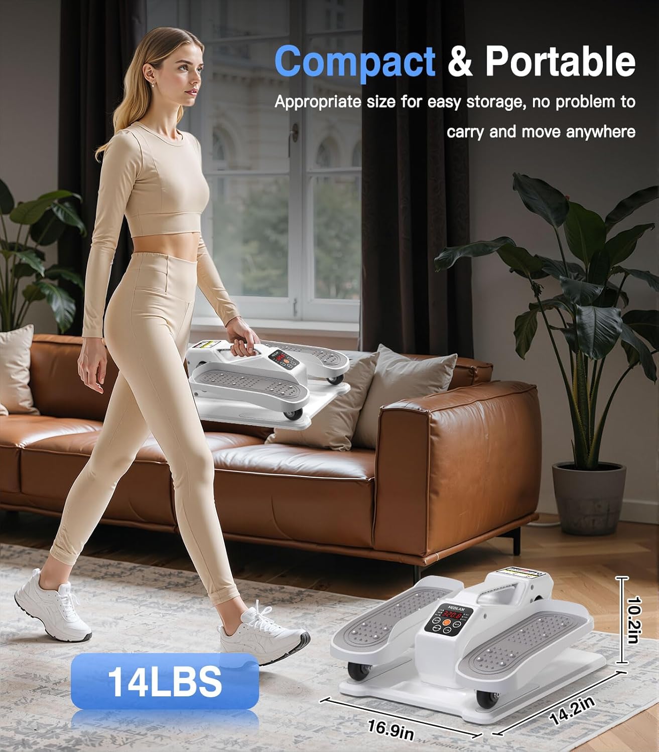 Under Desk Elliptical - Stay Active Anytime, Anywhere!Turn your sedentary moments into opportunities for movement with our Under Desk Elliptical, the ultimate compact exercise solution for seniors, office workers, fitness enthusiasts and anyone seeking gentle leg rehabilitation. Designed to fit seamlessly under your desk, couch or table, this space-saving elliptical allows you to improve burn calories and strengthen your legs - all while sitting!Key Features:- Compact and portable: Lightweight design (only 12 lbs) easily moves between home, office or travel.- Whisper-quiet operation: Work or relax undisturbed,perfect for shared spaces.- Adjustable resistance: 12 levels (HR-1 ~ HR-12) and 3 automatic mode speeds (P1 ~ P3) to suit fitness levels, from gentle therapy to active workouts.- Digital Monitor: Track time,pace,calories and distance to keep you motivated.- Non-slip pedals: Secure foot placement ensures safety during use.Specifications:- Product Net Weight:12 lbs - Product Size: 16.9 * 14.2 * 10.2 inches (fits under most desks)