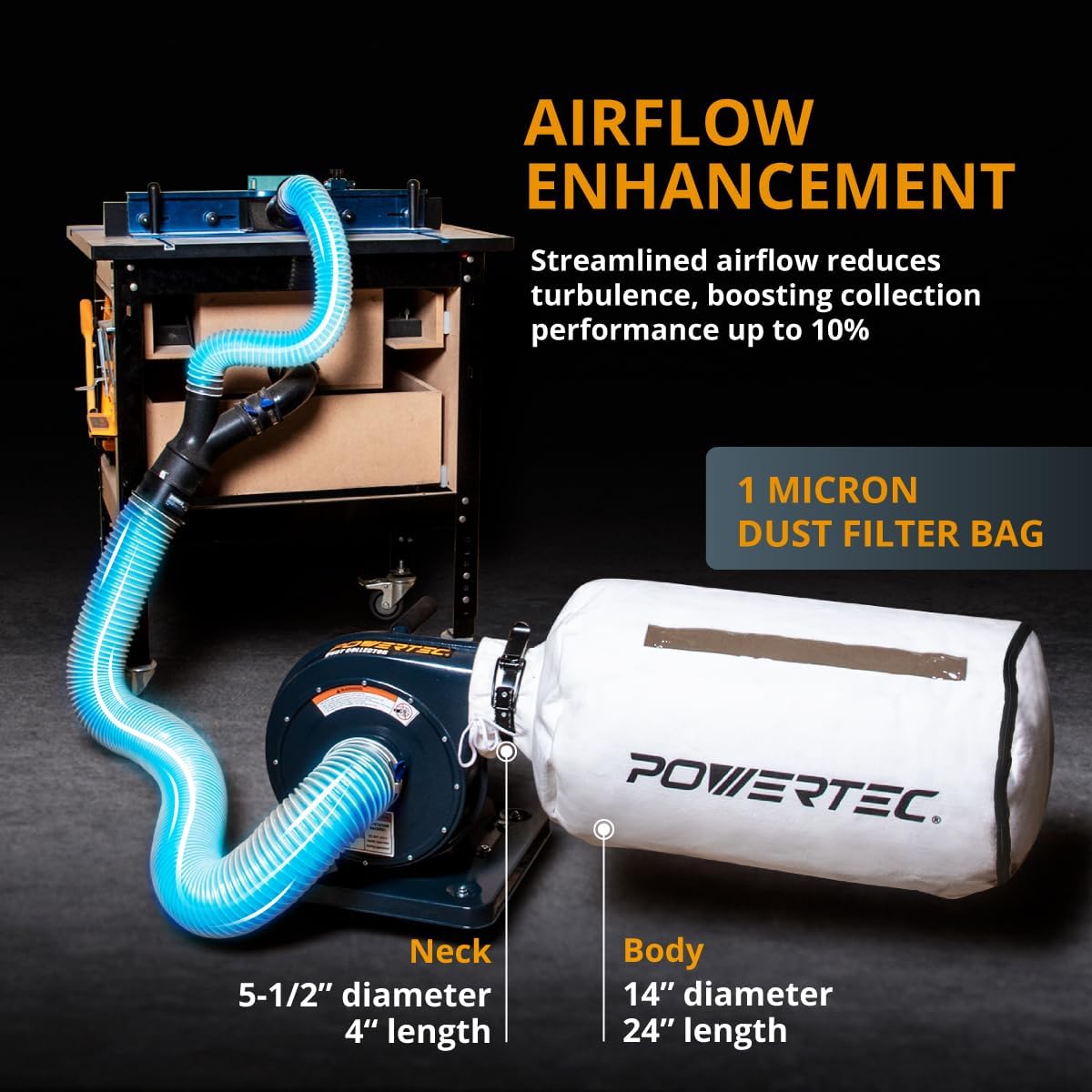 Introducing the POWERTEC Portable Dust Collection System and Accessories, designed for powerful dust extraction and a cleaner workspace. The Portable Dust Collector System is compact yet highly efficient, removing dust and debris directly at the source. Its Vortex Base optimizes airflow, reducing turbulence and increasing efficiency by up to 10% compared to similar models. Equipped with a 1 HP motor, 560 CFM air suction, and a 1-micron filter bag with a viewing window and bottom zipper for easy disposal, it delivers superior performance. For secure and flexible connections, the 4-Inch Dust Control Flex Cuff with Key Hose Clamps provides an airtight fit between 4-inch dust collection fittings or hoses. Made of durable rubber, this reusable coupler allows for quick interchangeability without tape or screws. Customers use it to connect PVC pipes to blast gates, attach table saws to dust sheriffs, and link sawdust exits to shop vacs. To bridge different hose sizes, the 4-Inch to 2-1/2-Inch Cone Reducer seamlessly steps down from a 4-inch ID hose to a 2-1/2-inch ID hose without compromising airflow. Made of heavy-walled ABS plastic, this adapter ensures durability and long-term use. Upgrade your workshop with POWERTEC’s high-performance dust collection system and accessories, designed for efficiency, durability, and a cleaner work environment.