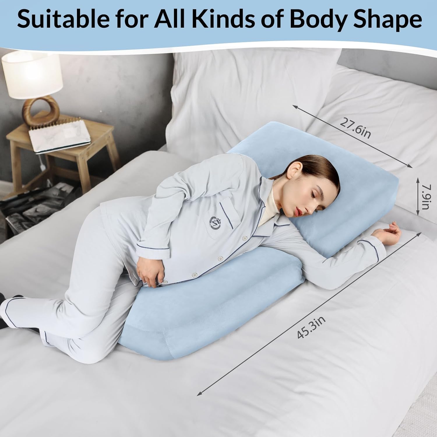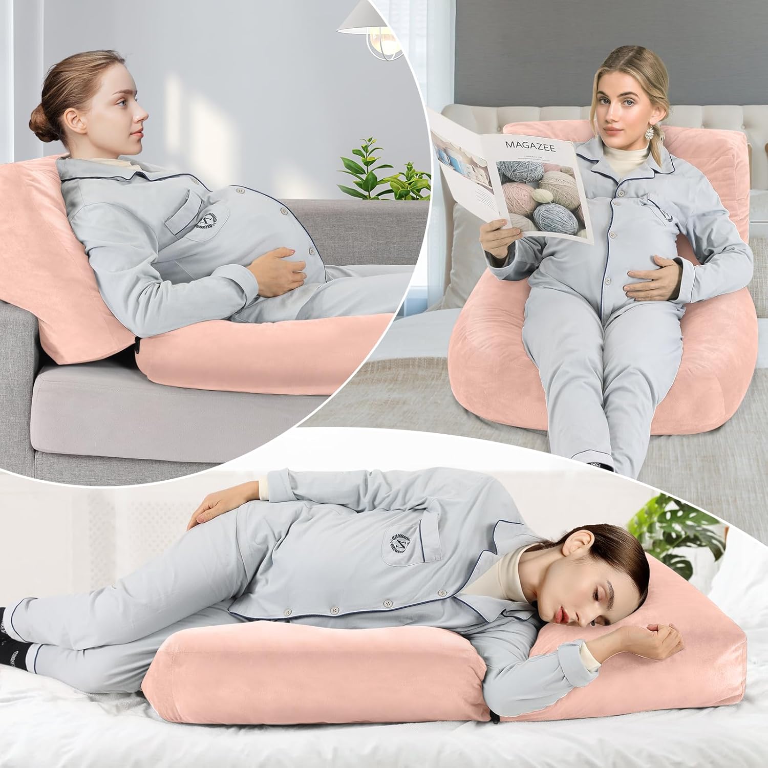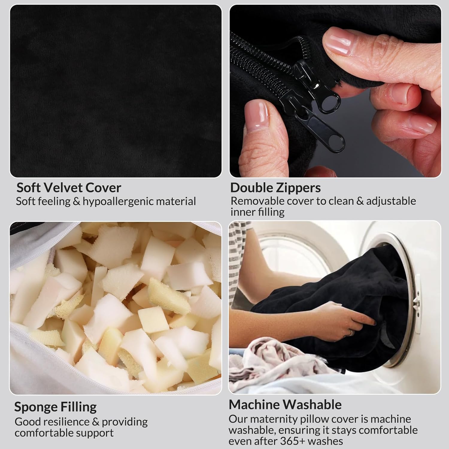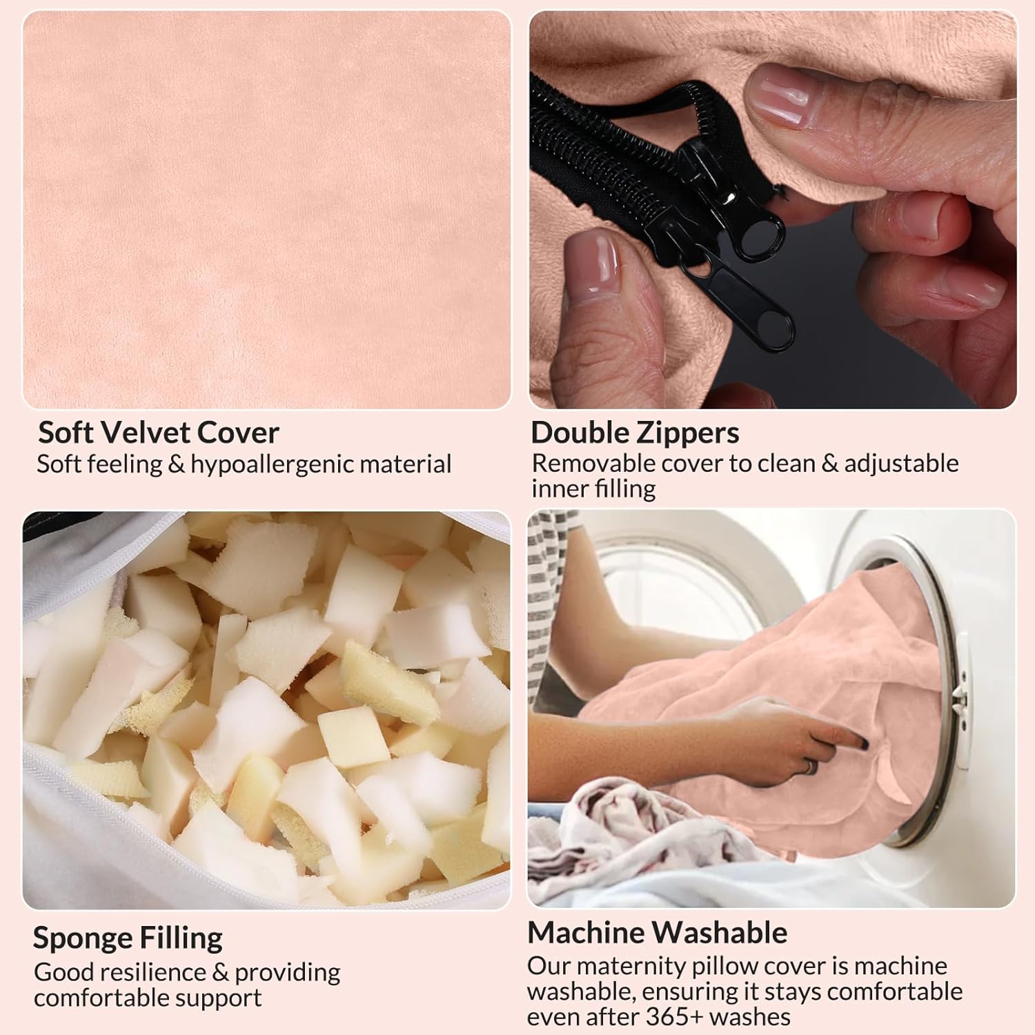【Warmly Tips】: Please pat the pillow and let it expand for at least 24-48 hours to make it fluffy enough before using. 【Soft Material & Pioneering Upgraded】: This pregnancy pillow uses short plush surface material and crushed sponge filling, which is soft and skin-friendly. It has more support than the traditional pp cotton filling, while maintaining the fullness and firmness of the pillow. 【Unique Design】: The middle of the pregnancy pillow adopts a circular cutout design, which can fit the abdominal curve well. Provide a good support for the abdomen of pregnant women. Helps to improve comfort during pregnancy. With our Pregnancy must haves cozy hug pillow, you can say goodbye to tossing and turning at night! 【Provide Support】: Our 45-inch full body pillow for adults features an ergonomic design, using this pregnancy pillow can provide you with good support and relieve pain in the abdomen, waist, back, neck and other parts. And two zippers with double interlocking stitching for durability. It is an ideal gift choice for pregnant mothers. 【Multi-Purpose】: Our pregnancy pillow is quite flexible so that you can change it in various positions. In addition to lying on your stomach, this pregnancy pillow can also be used while sitting in the hollow part in the middle. It can be used whether you rest at home or in a massage parlor. And you don't need to be pregnant to use it! 【Detachable & Machine Washable】: The maternity pillow has been upgraded with a detachable design. Double zippered outer pillow covering, which makes washing the cover easy and seamless. Simply throw the cover in the washing machine for a refreshed feel when needed.