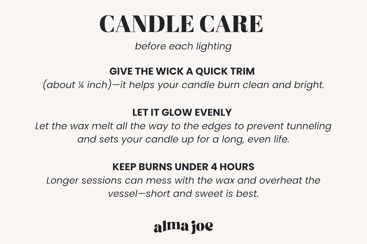| Product Care Instructions | Give the wick a quick trim (about ¼ inch)—it helps your candle burn clean and bright., Keep burns under 4 hours. Longer sessions can mess with the wax and overheat the ceramic—short and sweet is best., Let it glow evenly the first time. On your first burn, let the wax melt all the way to the edges (about 2–3 hours). This helps prevent tunneling and sets your candle up for a long, even life., Peek at the jar to make sure there are no cracks—safety first!, Place it somewhere steady and safe, away from drafts, curious kids, or playful pets. |